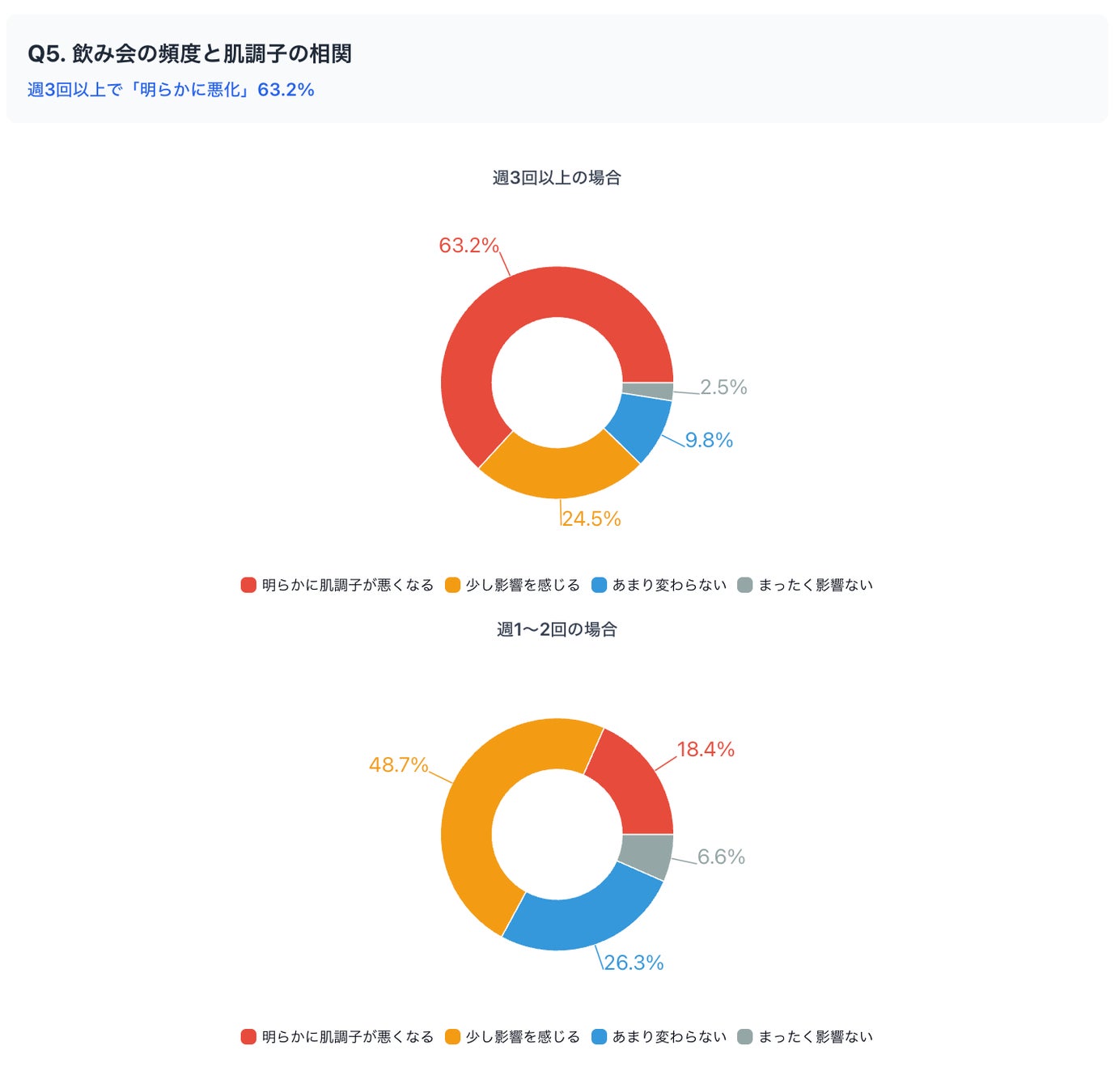 Q5. 週3回以上の飲み会で「明らかに肌調子が悪化」63%