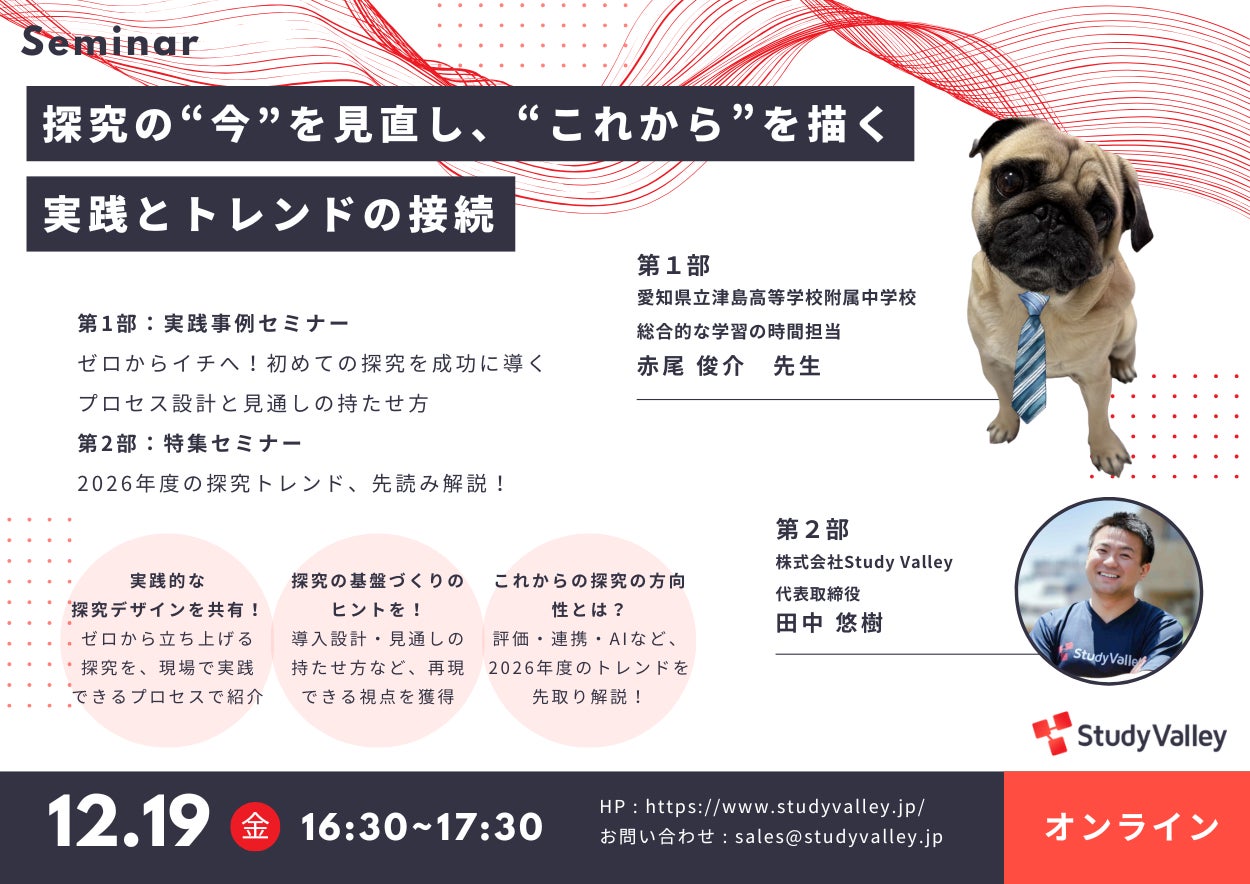 探究学習支援のリーディングカンパニーである株式会社Study Valley(本社:東京都江戸川区、代表取締役:田中悠樹)は、全国の中学校・高等学校教職員や教育委員会関係者を対象に、無料オンラインセミナー『探究の“今”を見直し、“これから”を描く:実践とトレンドの接続』を2025年12月19日(金)に開催いたします。