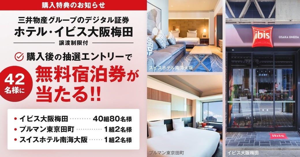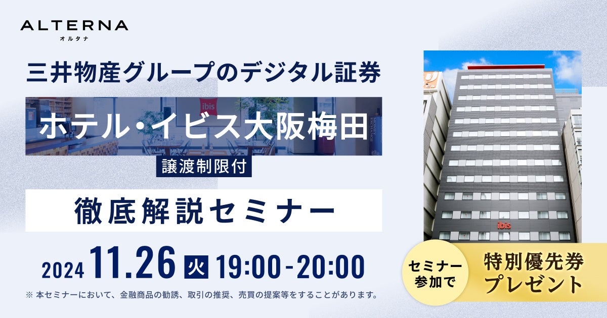 三井物産デジタル・アセットマネジメント株式会社(以下「当社」)は、当社が提供するデジタル証券を活用した安定資産投資サービス「ALTERNA(オルタナ)」において、「三井物産グループのデジタル証券~ホテル・イビス大阪梅田〜(譲渡制限付)(※1)」を公開、募集を開始しましたことをお知らせします。
