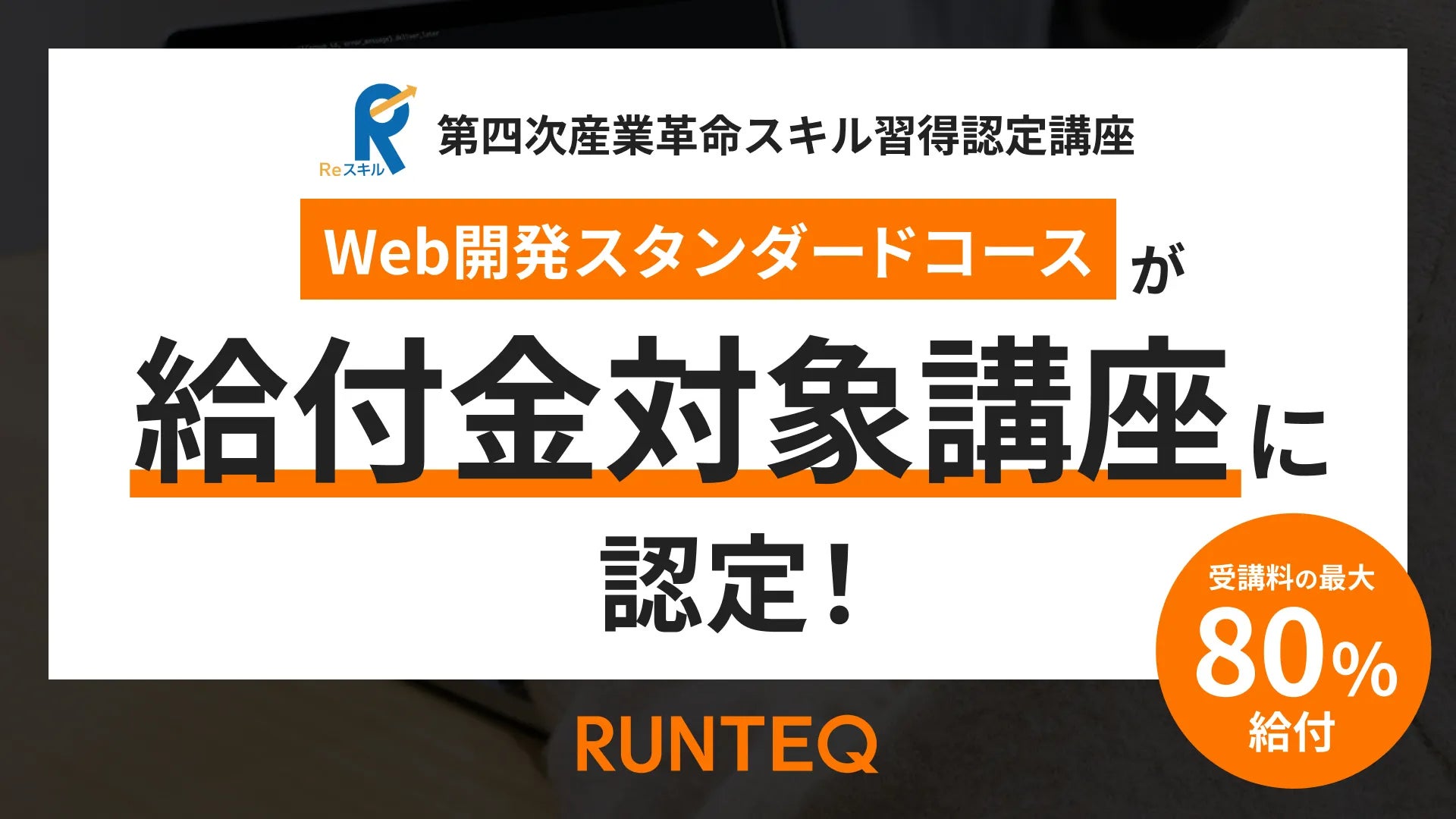 RUNTEQの『Web開発スタンダードコース』は、専門実践教育訓練給付制度の対象講座に認定されています。給付条件を満たすことで、受講料の最大80%(最大給付44万円)が給付金として支給されます。