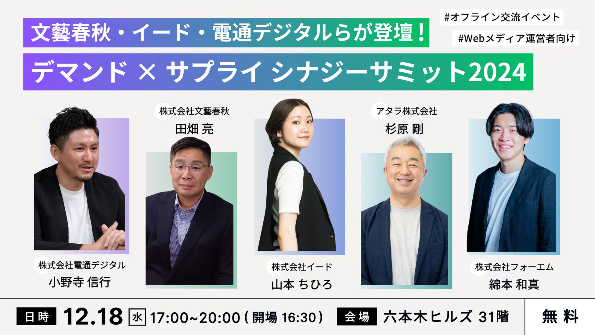 本イベントでは、デマンドサイド代表として株式会社電通デジタル、サプライサイド代表として、株式会社文藝春秋、株式会社イードが登壇します。また当社アドバイザーであるアタラ株式会社代表取締役CEOの杉原氏をお招きし、デジタル広告業界におけるデマンドサイドとサプライサイド双方での課題とその解決策をテーマにトークセッションを実施いたします。