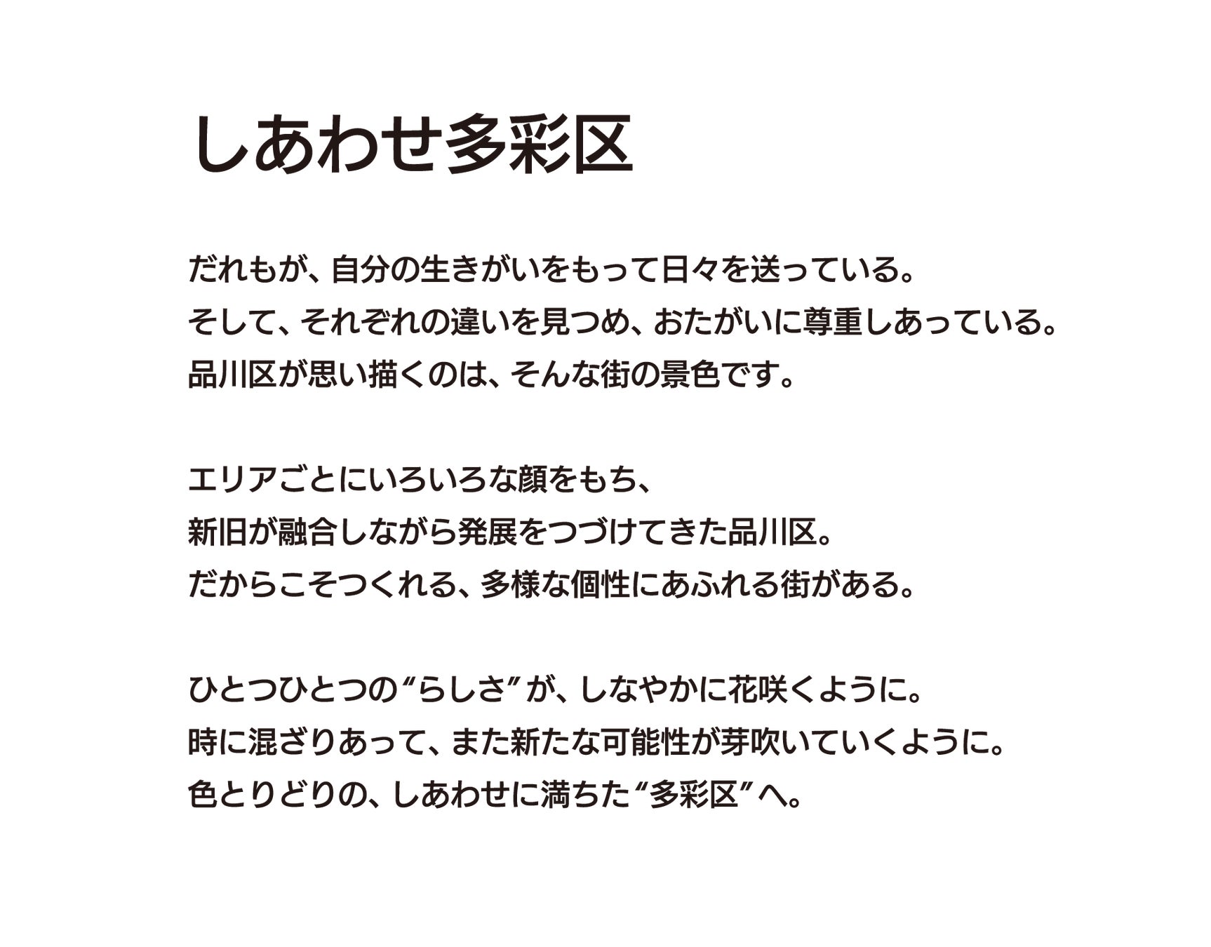 メッセージには、あらゆる人が自分らしく生きがいを感じ、それぞれの個性が尊重される、寛容で多様なまちを目指す品川区の思いを込めています。どんな違いがあったとしても、互いに理解し、補い合うことのできるまち。歴史ある文化と新たな価値が共存し、誰もが自分自身の可能性を活かし、その自然体な個性を発揮できる社会の実現を目指します。