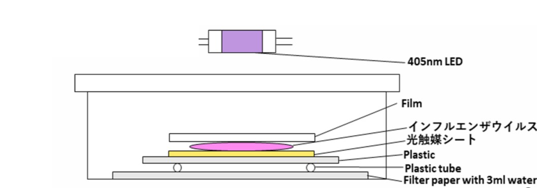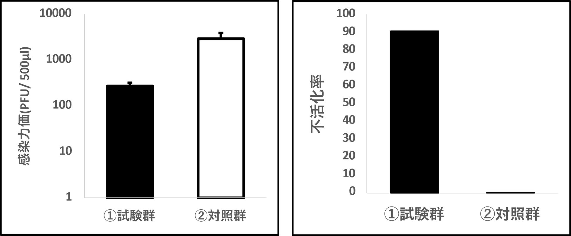 1時間の光触媒反応によって、ウイルスの感染力価が2933プラーク形成単位(PFU)/500μlから、273PFU/500μlまで減少し、その不活化率は90.7%であった。