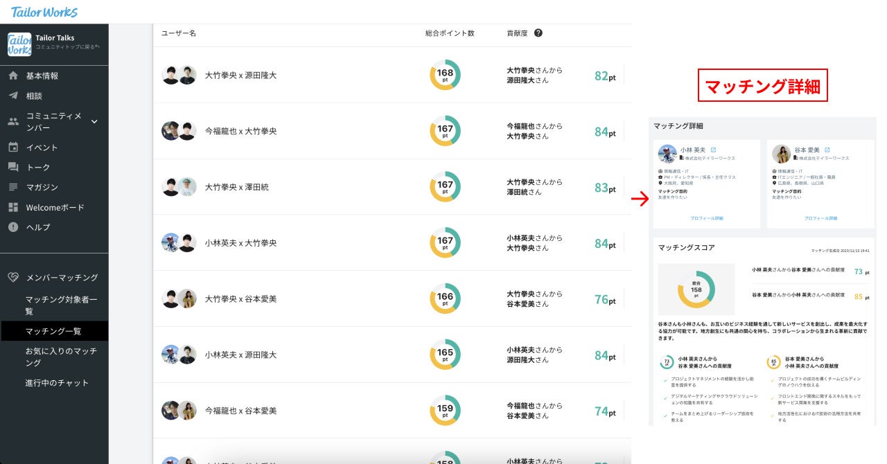 ・ユーザー同士のマッチング一覧をコミュニティ運営者に提案
