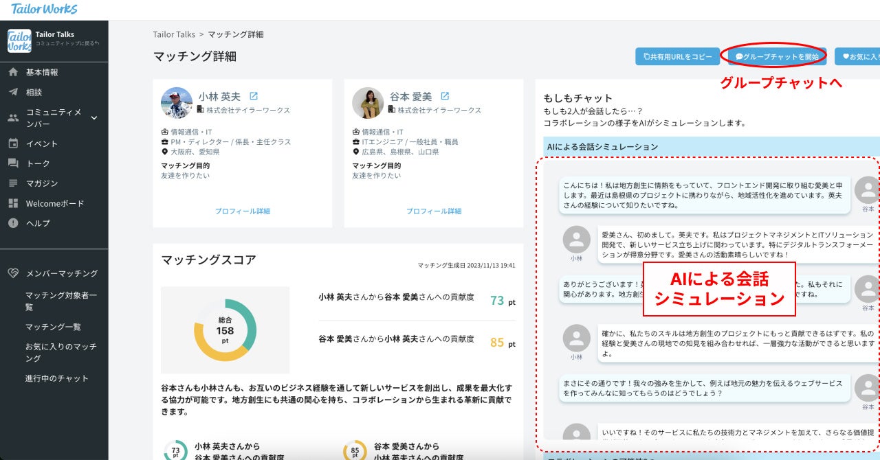 マッチング候補者同士の初回コミュニケーションをAIがシミュレーション。コミュニティ運営者はグループチャットを開始し、ユーザーによる実際の会話の場を設定することができる。