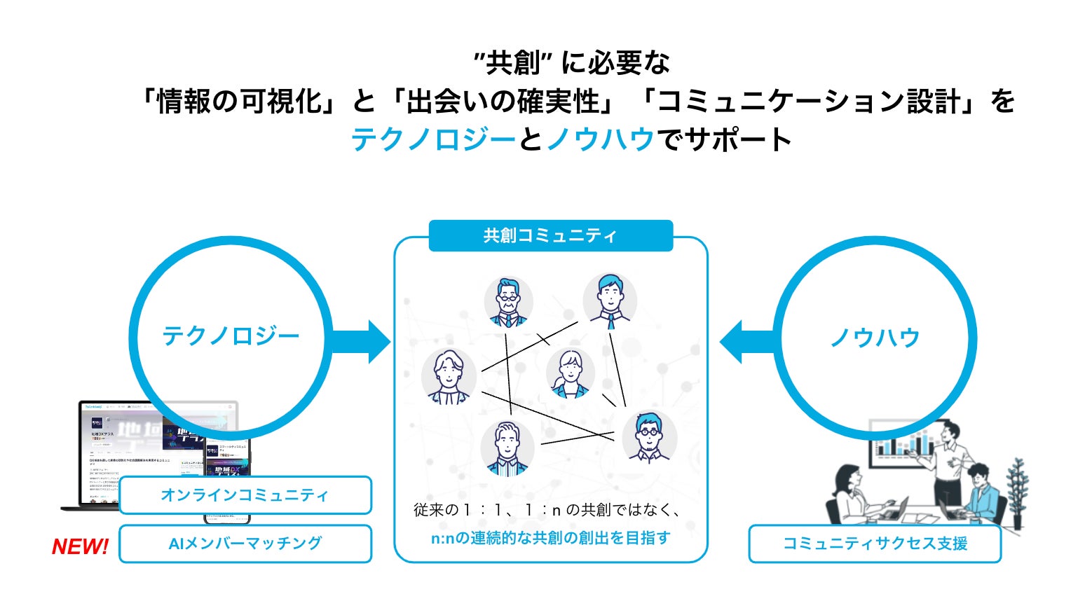 ”共創” に必要な「情報の可視化」と「出会いの確実性」「コミュニケーション設計」をテクノロジーとノウハウでサポートすることで事業者間の共創に再現性を持たせ、地域産業の発展や社会課題解決に貢献します。