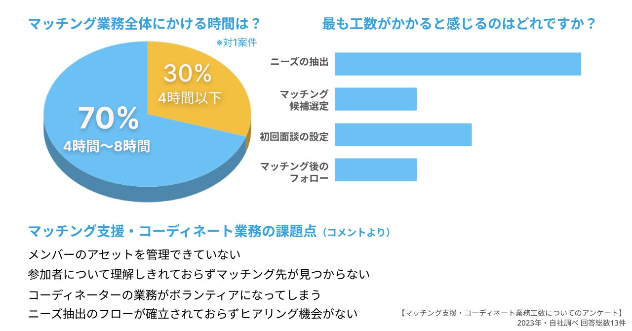 しかし、顧客や会員、従業員といったステークホルダー同士のマッチングを行う企業・団体の担当者やコミュニティ運営者の間には、「工数は多いがリソースが不足」「候補者の情報やスキルが明示されず、担当者の裁量に依存」といった共通の課題があることが当社調べのアンケートでも明らかになりました。