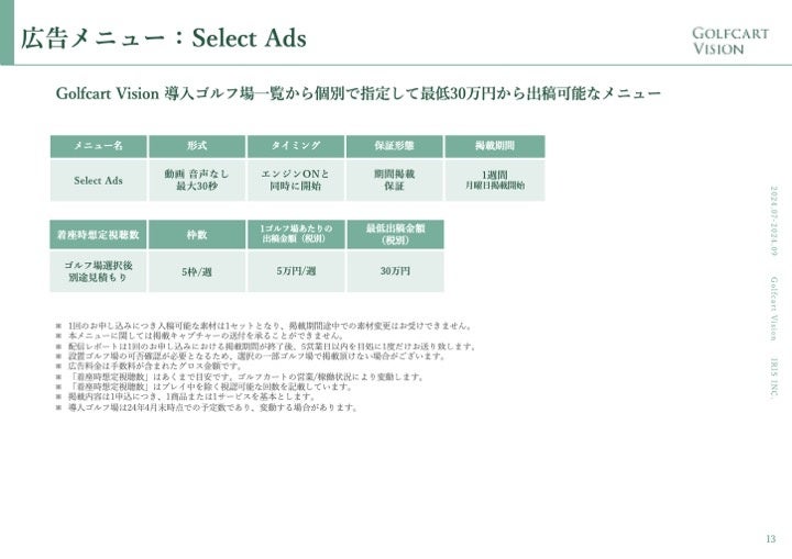 2024年7月以降は、Golfcart Visionを導入している全ゴルフ場に広告配信する「Regular Ads」に加え、Golfcart Visionを導入しているゴルフ場一覧から、個別で指定したゴルフ場に対してのみ広告配信が可能な「Select Ads」を新規メニューとして追加しました。