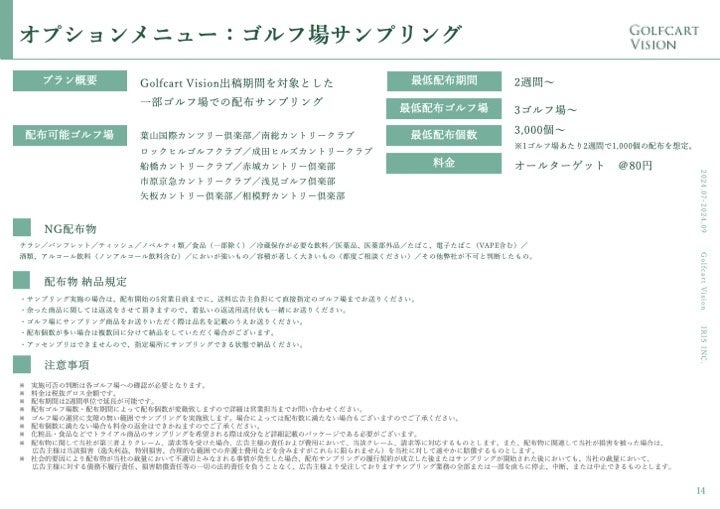 Golfcart Visionを導入している一部ゴルフ場を活用した、サンプリングメニューが誕生しました。広告配信のオプションとしてゴルフ場でのサンプリングを組み合わせて実施いただくことで、認知から体験まで、立体的なコミュニケーションが可能となります。