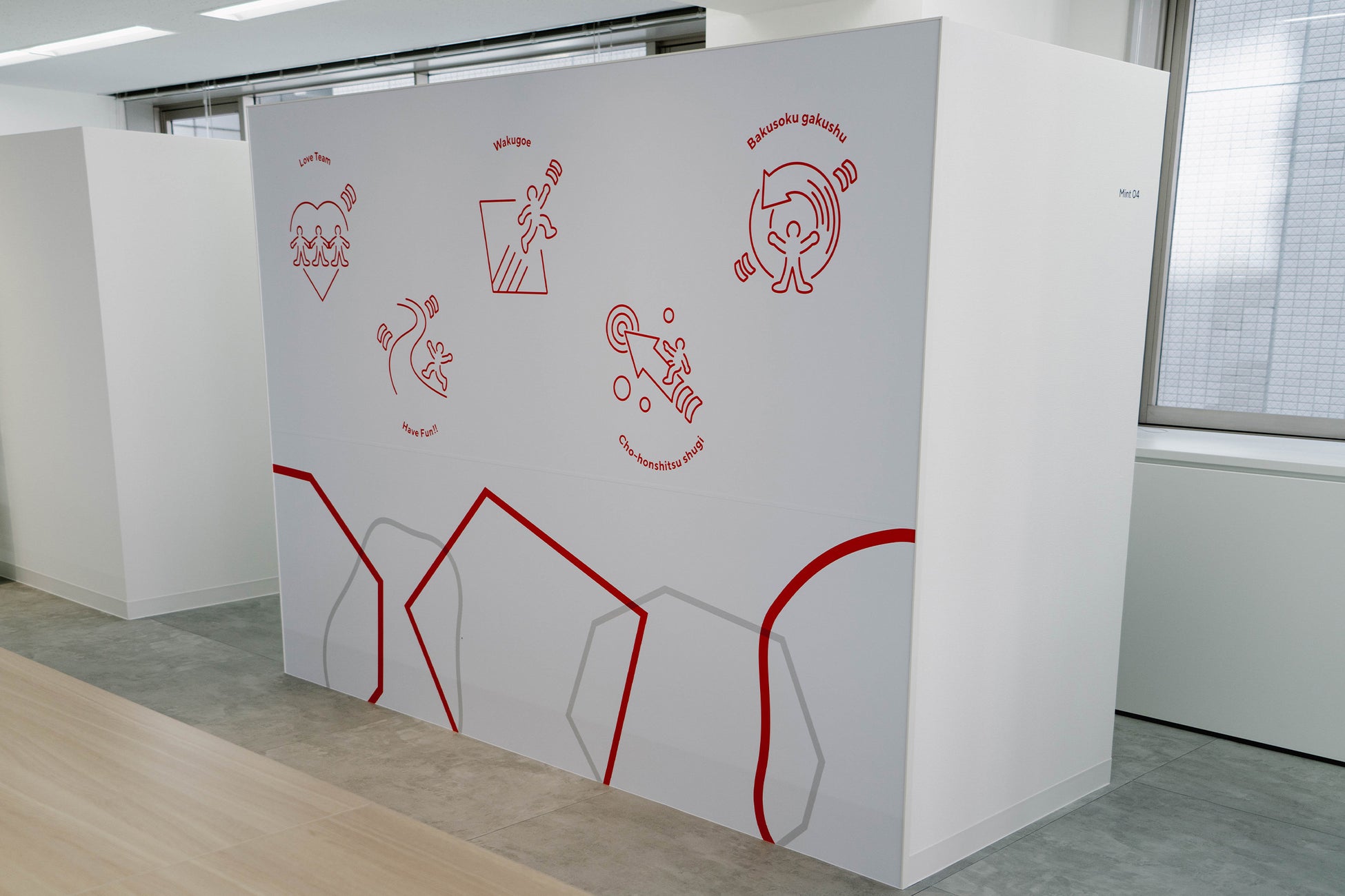 執務スペースから見える位置に、PhilosophyやValueが掲示されております。これによりチームワークが育まれるとともに、常に「わくわく」が生まれるような空間となっております。