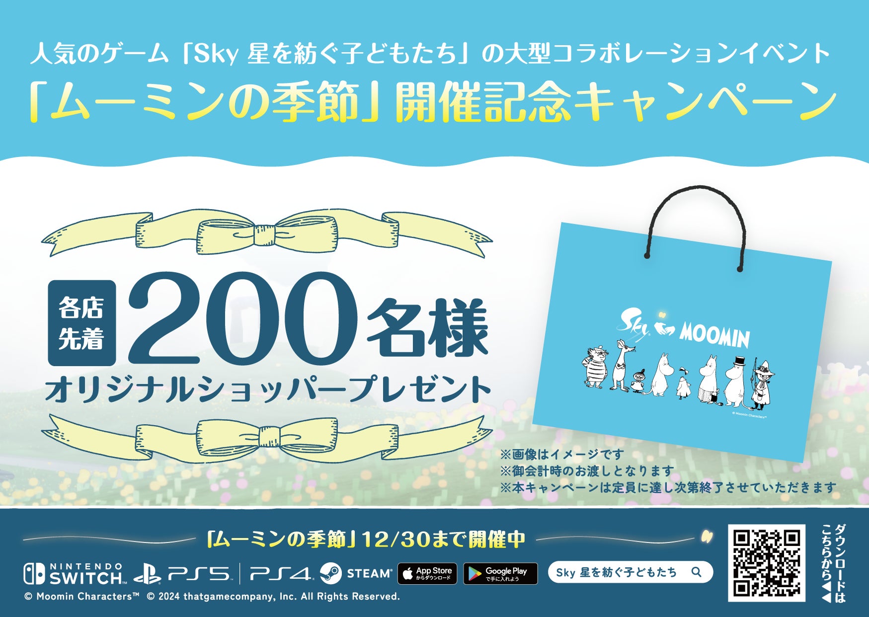 thatgamecompany,Inc.(本社所在地 アメリカ合衆国カリフォルニア州)の運営中タイトル『Sky 星を紡ぐ子どもたち』(以下Sky)は、ムーミンとの特別コラボレーションイベント「ムーミンの季節」の開催を記念し、この度、埼玉県・飯能市に位置するムーミンバレーパークや全国のムーミンショップ、ムーミンショップ カジュアルエディションとの特別コラボレーションが決定いたしました。