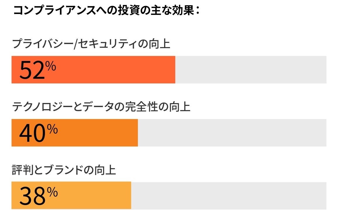 今年の調査では、「規制」と「コンプライアンス」も重要なテーマとして浮上してきました。回答者の42%が、規制やコンプライアンスの要件に対応するために、IT予算の5%以上を費やしていると回答しました。さらに、回答者の38%が、業界の規制要件や認証に対応するため、週の10%以上の時間を費やしていると回答しました。しかし、このような規制やコンプライアンスへの投資は、企業・組織にプラスの影響を与えており、プライバシーやセキュリティのベースラインレベルの上昇(52%)、テクノロジーやデータの完全性の向上(40%)、企業・組織の評判やブランド評価の向上(38%)などが報告されました。