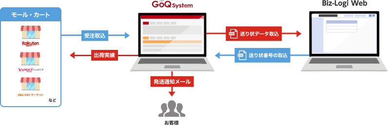「Biz-Logi Web」を通して出荷予定の受注データを「GoQSystem」から一括で出力することが可能になりました。また、「Biz-Logi Web」内で発行された送り状番号の一括取込にも対応しています。