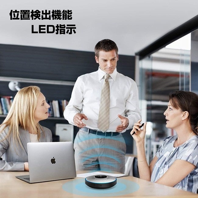 ⑤話している人の方向を自動的に検知して集音力を個別に高めクリアに集音してくれる「位置検出機能」を搭載。本体のLEDが光って検知している方向を一目で把握できます。また「オートゲインコントロール」機能により発言者の距離を自動的に検知、一定音量に増幅するので参加者の音声をクリアに拾い上げます。