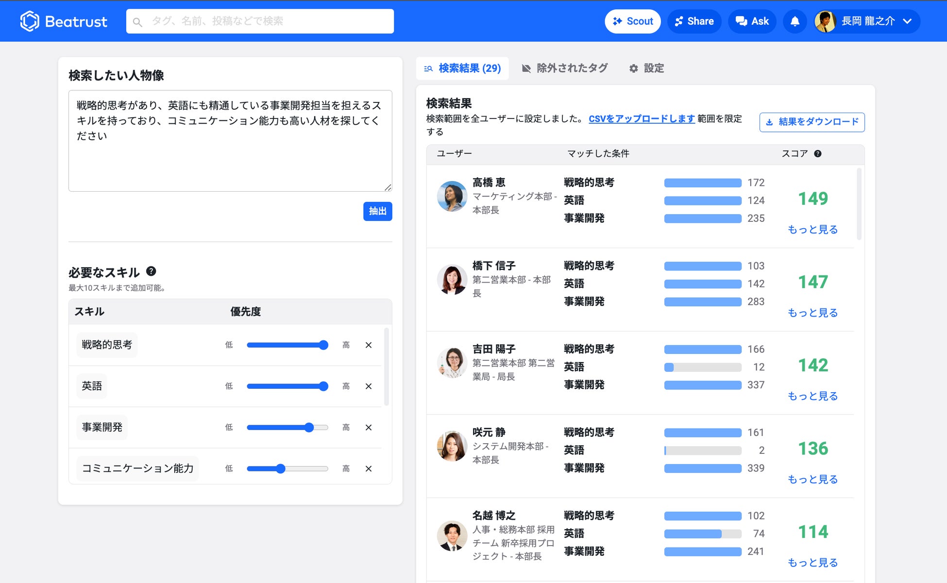 Beatrust株式会社(本社:東京都港区、代表取締役:原邦雄 以下、Beatrust)は、自社が運営する社員の自律的協業を促すタレントコラボレーションプラットフォーム『Beatrust』の新たな機能として、生成AIを活用し、社内のスキルデータベースから新プロジェクト等の適任者を発掘できるサーチ機能「Beatrust Scout(スカウト)」および、社内のソースから従業員のスキルや経験を自動的に抽出・可視化する「Tag Extraction(タグ抽出機能)」を提供開始します。