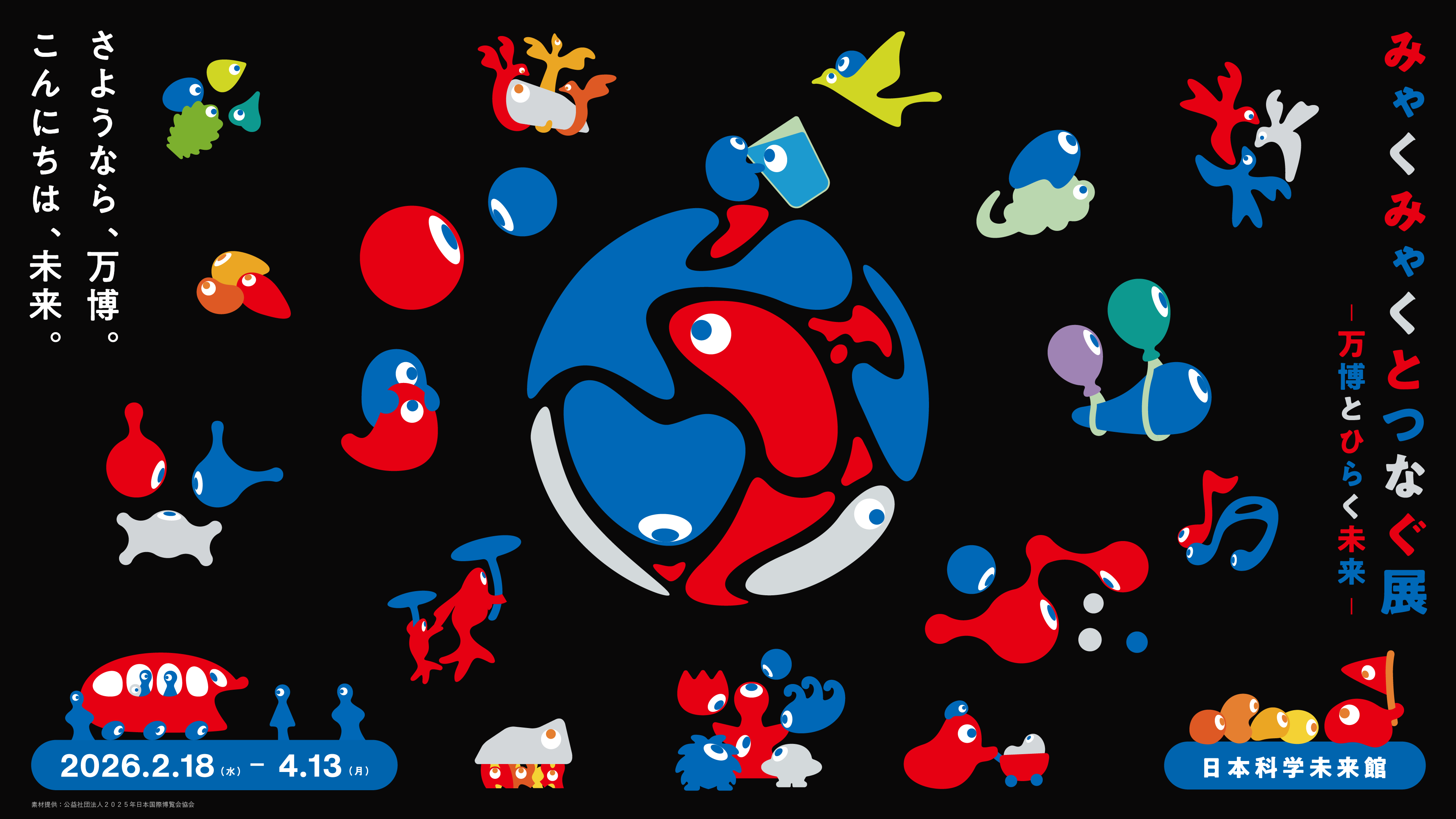 日本科学未来館(略称:未来館 館長:浅川智恵子)は、「未来社会の実験場」のコンセプトのもと開催された「大阪・関西万博」を振り返り、その成果を未来へとつなぐ企画を実施します。第一弾として、「みゃくみゃくとつなぐ展 ~万博とひらく未来~」を、2026年2月18日(水)~4月13日(月)に開催します。