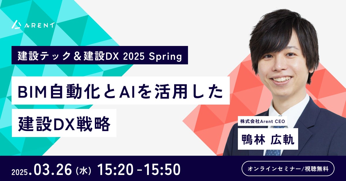 建設DXを推進する株式会社Arent(東京都港区、代表取締役社長:鴨林広軌、証券コード:5254 東証グロース、以下「当社」)は、2025年3月26日(水)日経クロステックが主催するオンラインセミナー「建設テック&建設DX 2025 Spring」に登壇します。