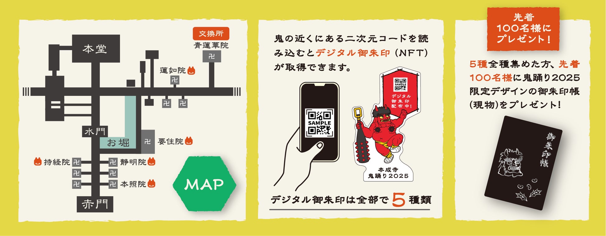 一般社団法人ジャパン・コンテンツ・ブロックチェーン・イニシアティブ(略称、一般社団法人JCBI)は、地方創生2.0を推進するために「地方創生2.0デジタル文化財プロジェクト」を開始することをお知らせします。同プロジェクトの第1弾の取り組みとして、新潟県三条市の法華宗総本山 本成寺へ、節分の伝統行事「鬼踊り」が開催される2025年2月2日に参詣すると、デジタル御朱印NFTを拝受できる周遊ラリーを、加盟企業3社(博報堂、博報堂プロダクツ、SingulaNet)と実施します。