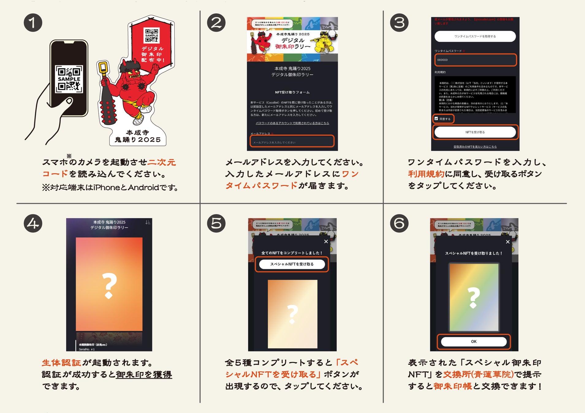 そして、当該プロジェクトの第1弾の取り組みとして、日本固有の無形文化財であり、近年注目を集めている御朱印をデジタル文化財化し、観光産業における旅行者の誘致促進に活用することを目的として、新潟県三条市の法華宗総本山 本成寺において、三条観光協会の後援の下、JCBI加盟企業3社(博報堂、博報堂プロダクツ、SingulaNet)からの協力を得て、デジタル御朱印ラリーを節分の伝統行事「鬼踊り」が開催される2025年2月2日に実施します。