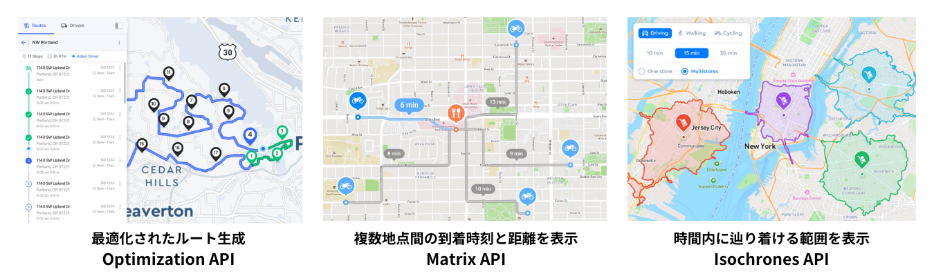 マップボックス社では、デジタル地図描画のためのMapsや検索機能のSearchのプロダクトに加え、Navigationプロダクトにおいてもルート生成や経路案内に有益な個別機能を多数提供しています。今回は複数地点間の所要時間と配車順序を最適化したルートを生成するOptimization APIをメインに、複数の出発・到着地点間の距離と到着予定時刻を可視化するMatrix API、特定時間内で到着できる範囲を計算して地図上に色付けして示すIsochrone APIの3つの機能をカスタマイズして提供しました。これにより、管理者による最適なタクシー乗合ルートの生成や、車両の配車が従前よりはるかに効率化し、到着予測時刻の高い精度と、コスト削減に寄与します。