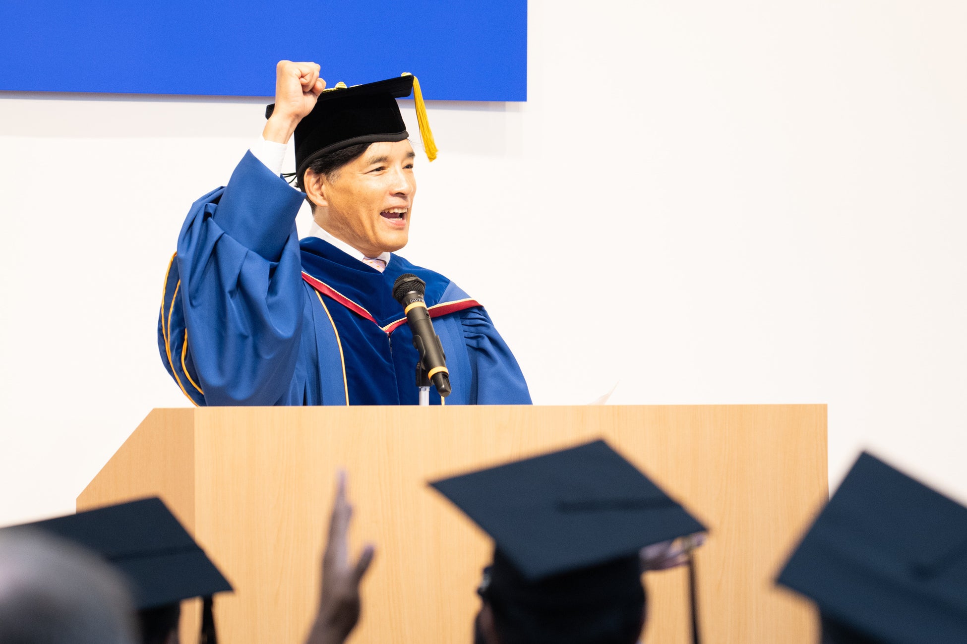 「ソクラテスによれば、哲学とはこの世に生を受けた魂として『よく生きる方法を学ぶこと』を意味します。哲学というと難しく考えてしまいますが、なんてことはない。『よく生きることを考え続ける』ことが哲学なのです。皆さんはグロービスでの学生生活を通して、自分を信じる方法を学びました。自らを信じなければ、誰が自分のことを信じ、信頼するでしょうか。自分の人生なのだから、自身の哲学を追い求めることが重要です。他人の価値観ではなく、自身の価値観で生きてください」