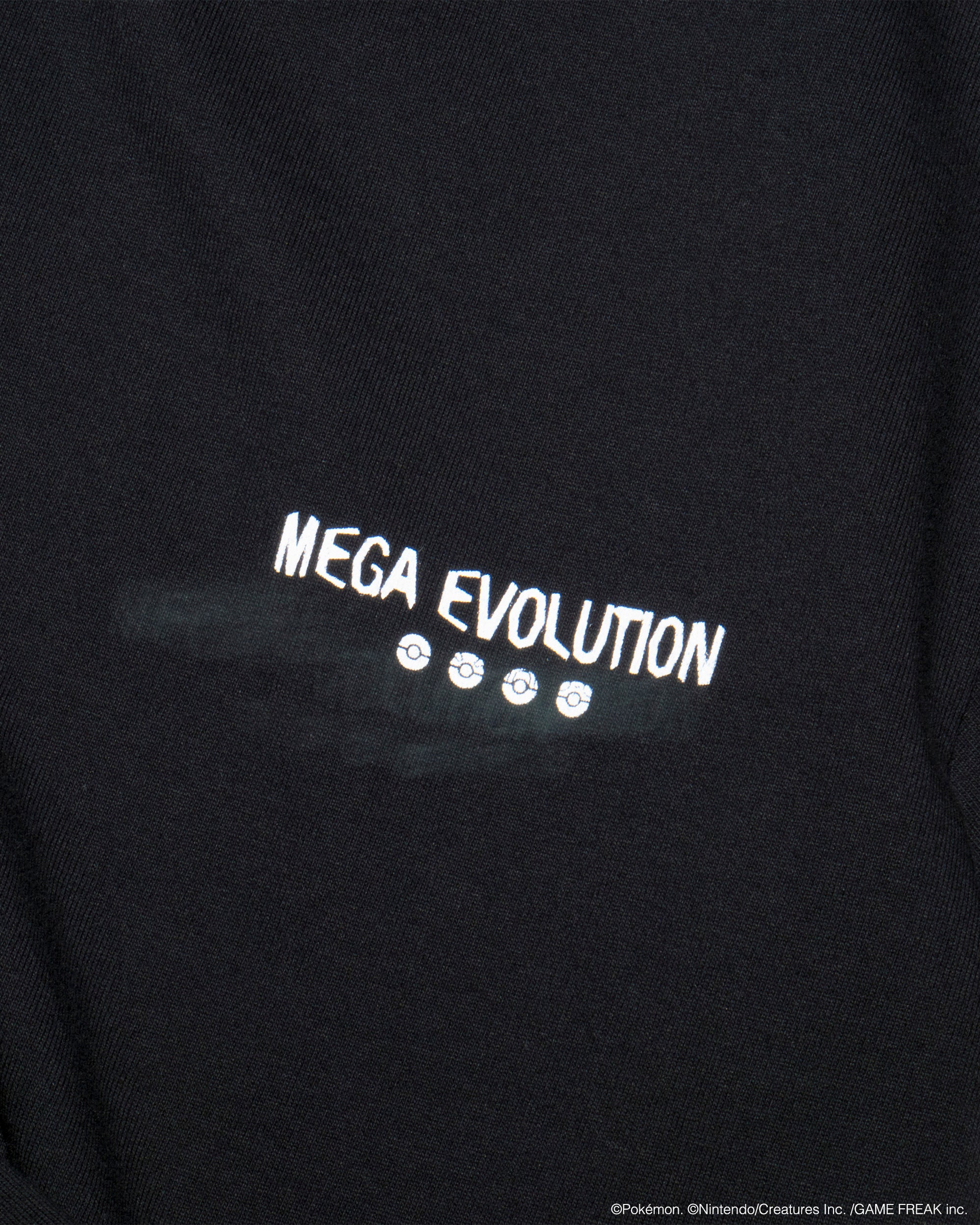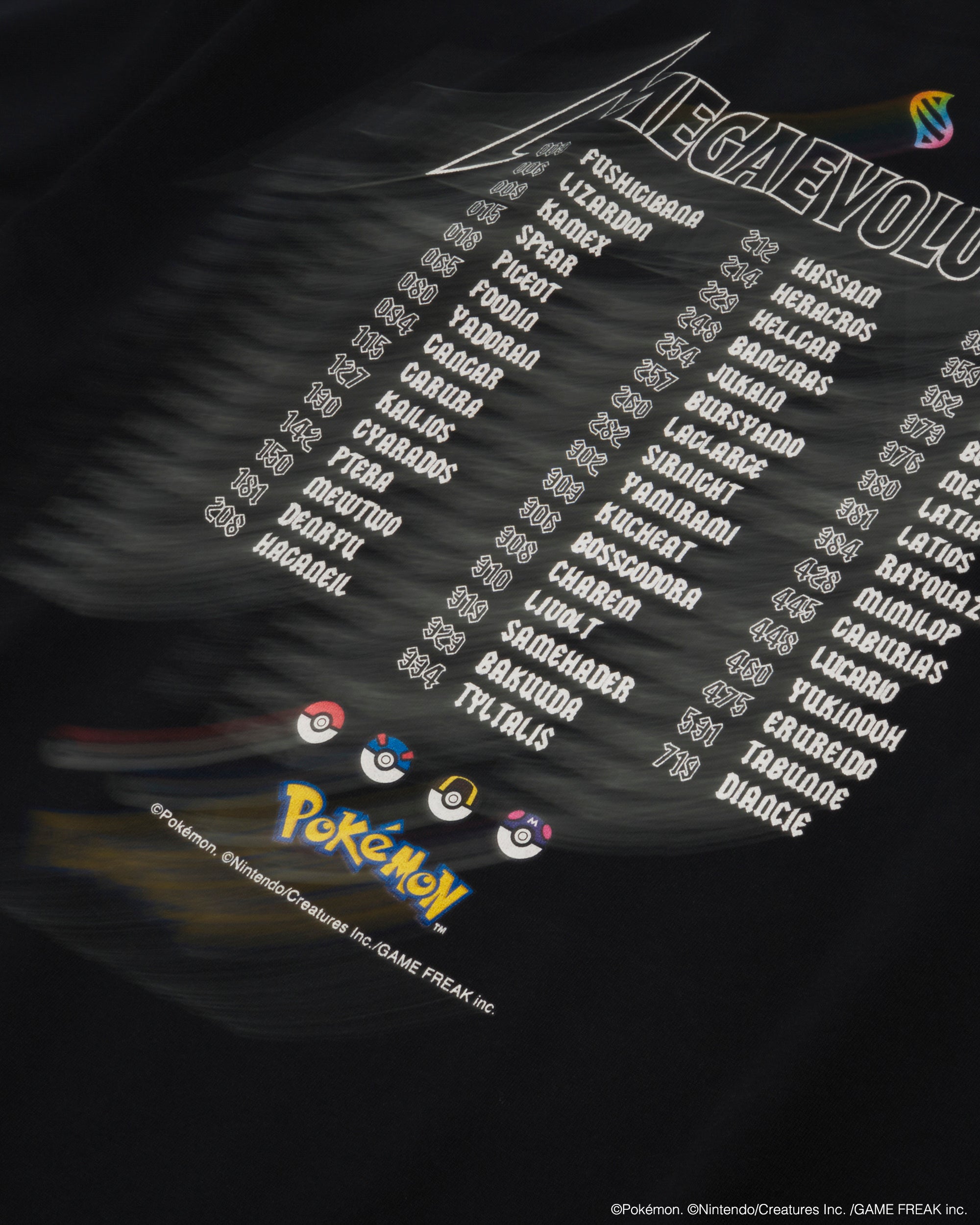 UNITED TOKYOからは、トレンド感あふれるバンドTシャツ風デザイン。ウォッシュ加工によるヴィンテージライクな仕上がりが特徴です。メガリザードンXとメガリザードンY、2種類の展開となっております。今回のゲーム発売に合わせて描き下ろされた特別なグラフィックを前面にプリントしております 。背面には、すべてのメガシンカポケモンの図鑑番号と名前が並び、ファン垂涎の一枚となっています。
