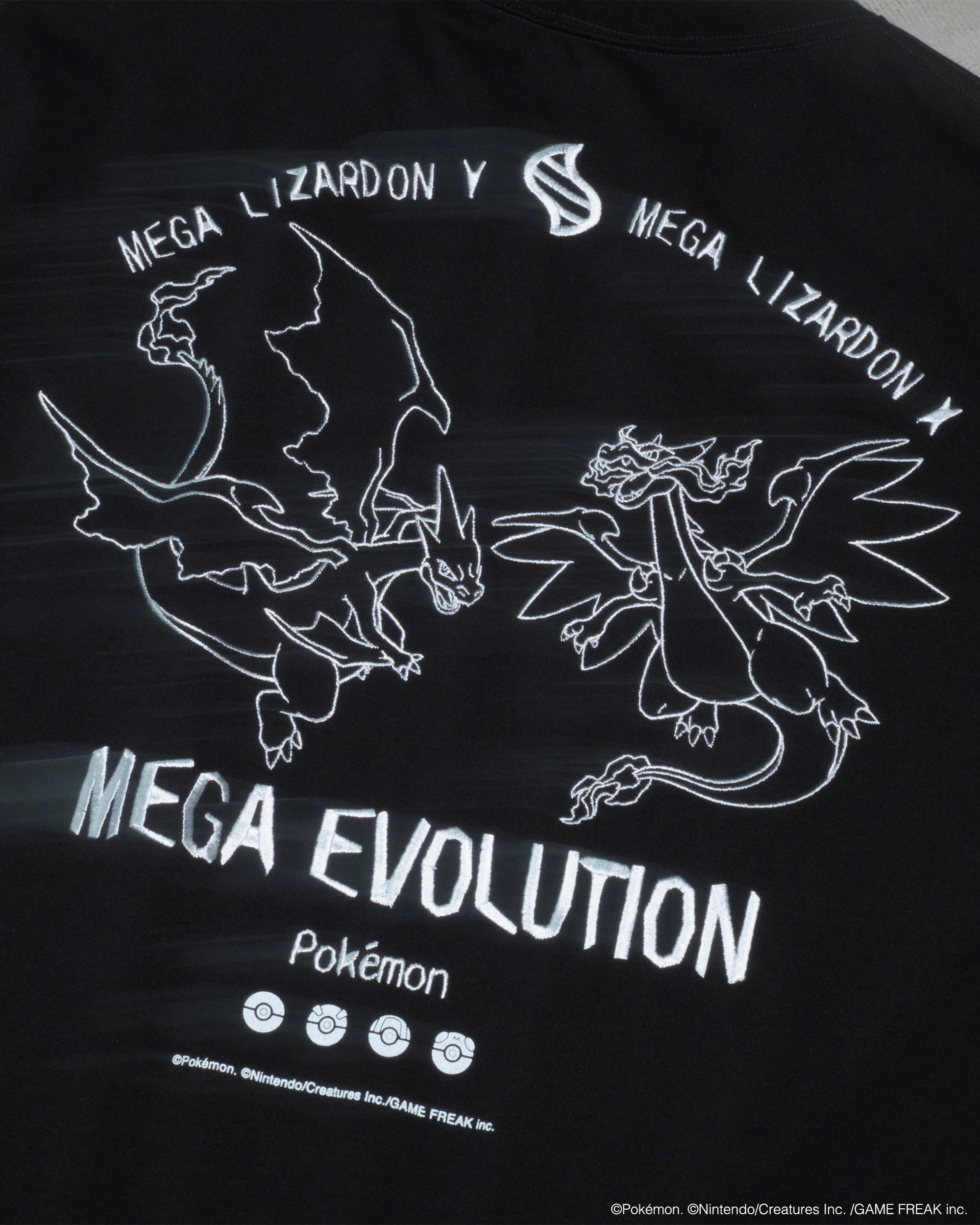 GOOD EDITIONからは、クラフトマンシップが息づく刺繍仕立てのスーベニアTシャツをご用意しました。背面には、メガリザードンXとメガリザードンYを繊細な刺繍で描写。艶やかで立体感のある糸使いによって、まるで一枚のアートピースのように仕上がっています。またこちらデザインのみキッズサイズ(120cm)も展開致します。