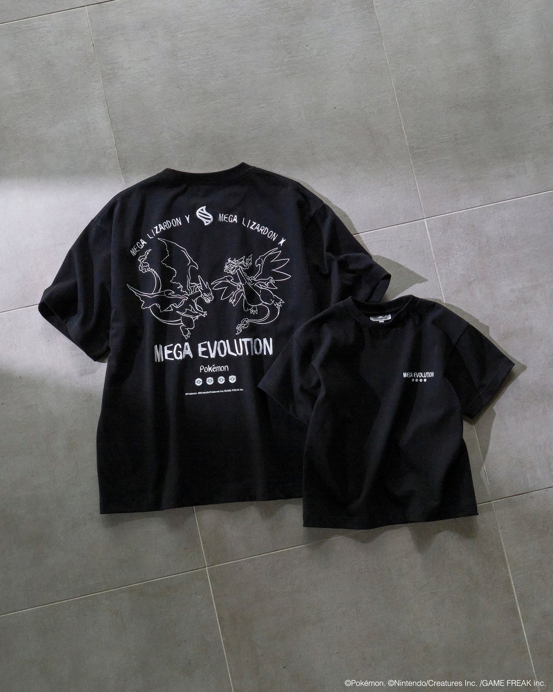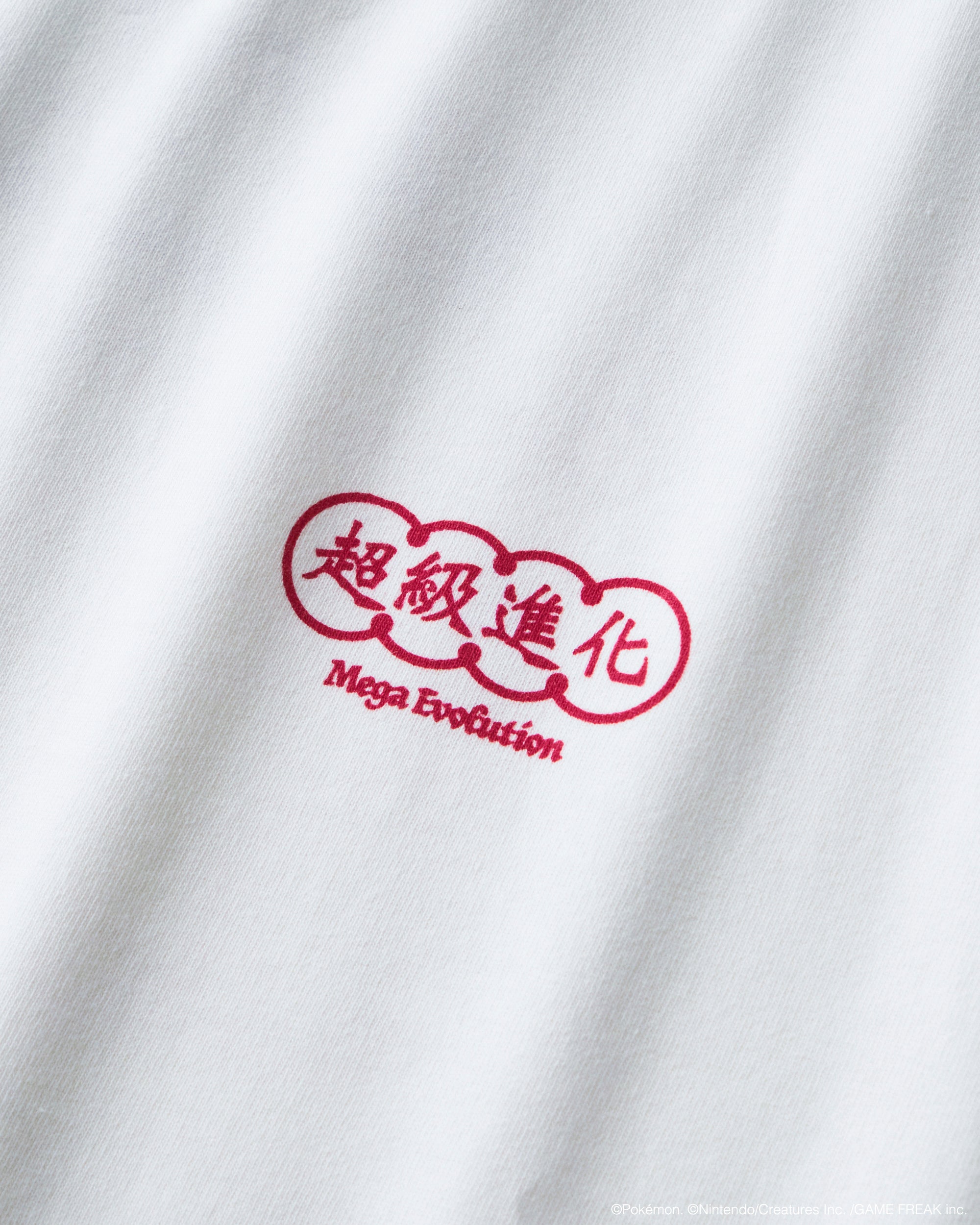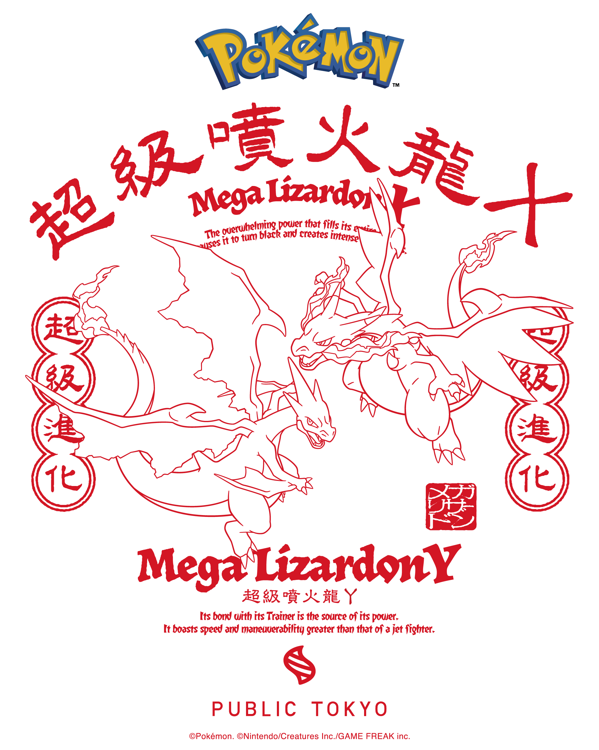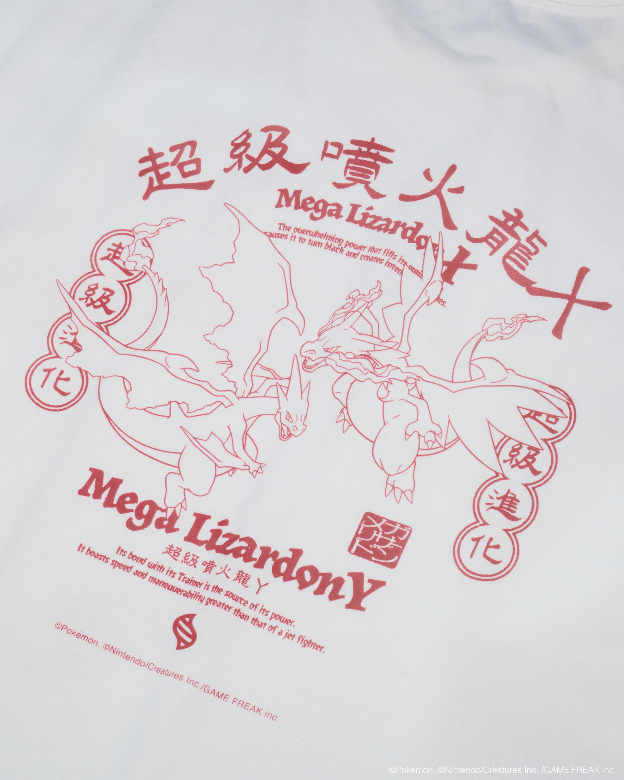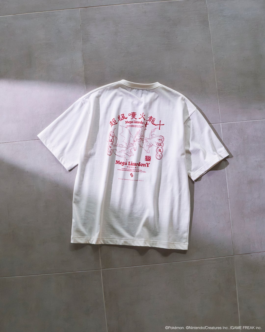 PUBLIC TOKYOでは、どこか懐かしくも異国情緒漂う中華料理店風デザインのTシャツをご用意しました。背面に大きくメガリザードンXとメガリザードンYを配し、中国語訳の「メガシンカ」も前面にあしらわれています。日常の中にさりげなく遊び心を取り入れたい方におすすめです。