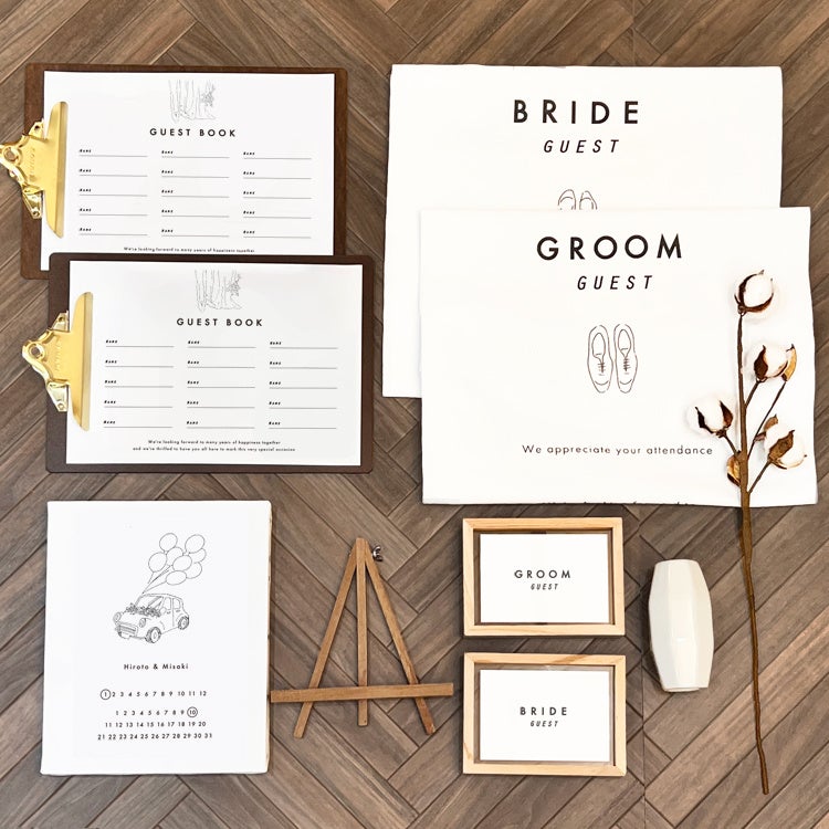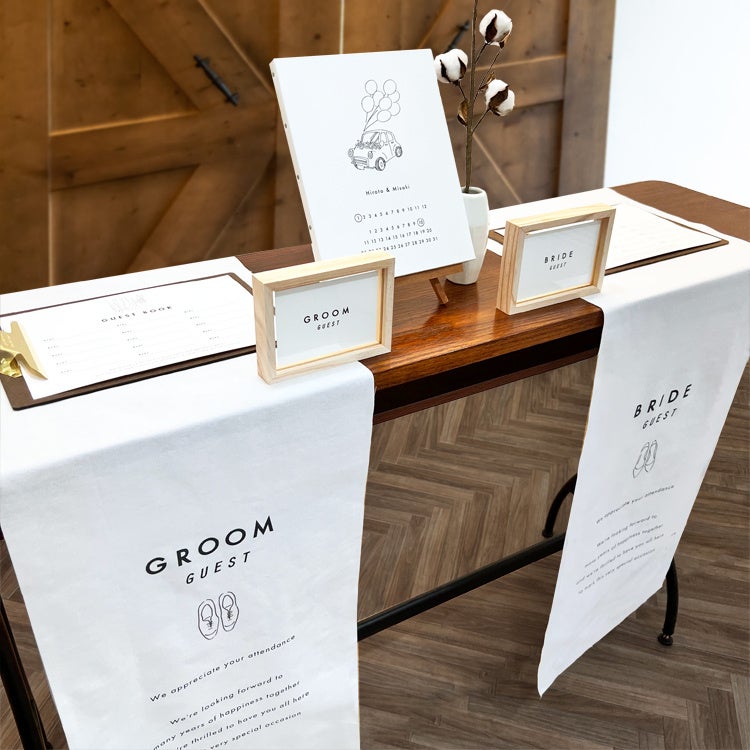 【GROOM(新郎)】【BRIDE(新婦)】の文字が入ったタペストリーや受付サイン、ゲストのお名前をご記帳していただく芳名シートなどの受付に必要なアイテムがひとつになっている完璧なセットです。