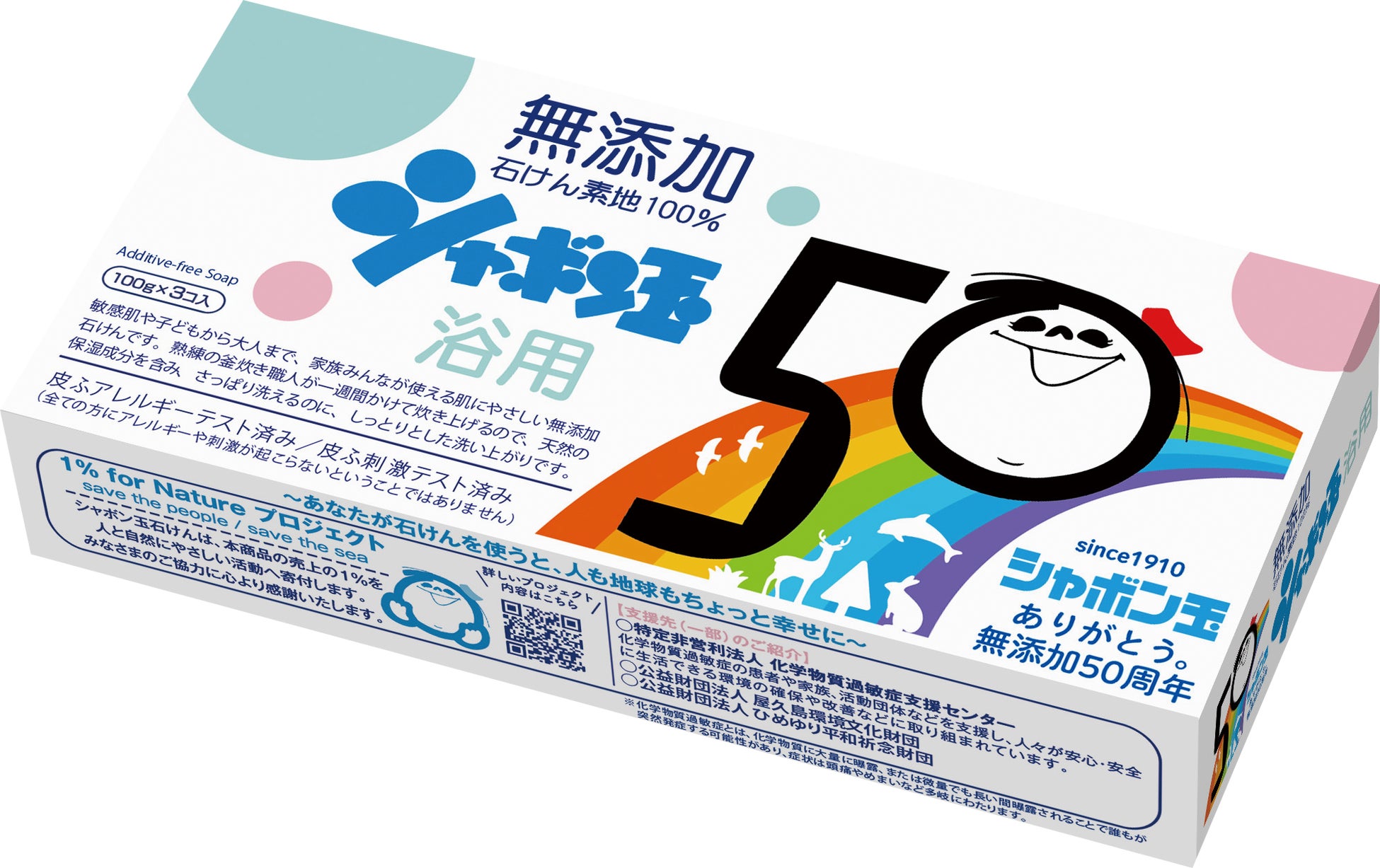 無添加石けんのパイオニアであるシャボン玉石けん株式会社(本社:福岡県北九州市/代表取締役社長 森田隼人)は、「無添加石けん※」の製造・販売に切り替えて2024年で50周年を迎えます。50周年を迎えた感謝をお客様にお伝えするアニバーサリー企画第1弾としまして、周年ロゴがデザインされた限定パッケージの「シャボン玉浴用3個入り」を2024年3月上旬より発売いたします。
