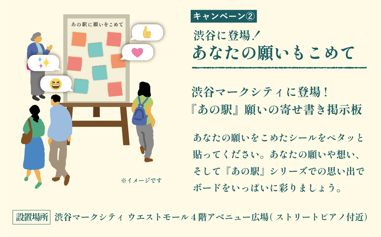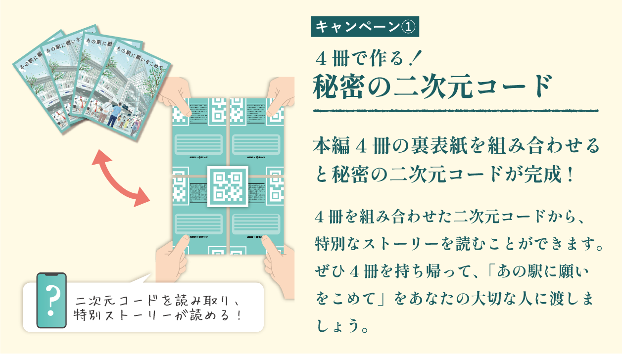 さらに、「あの駅」完結記念キャンペーンとして、本編4冊の裏表紙を組み合わせてできる二次元コードから特別なストーリーをお楽しみいただける体験の提供や、渋谷マークシティに皆様の願いや「あの駅」への想いで彩っていただける寄せ書き掲示板の設置などを行い、シリーズの完結を盛り上げ、沿線の魅力発見および移動需要の創出につなげて参ります。