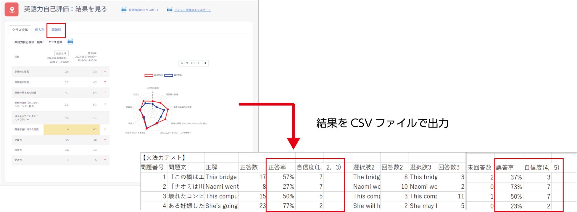小テストの詳細な回答結果はCSVファイルでエクスポートが可能です。特に学習者の自信度も測定する「文法力」のテストでは、「自信がなかったが正解していた」「自信があったのに不正解だった」問題も把握することができます。学習者はその後の学習で何に重点を置くべきかなどの学習の指標に、先生はその後の授業でどの文法用法や語彙のポイントを解説すればよいかなど指導をより明確にすることができます。