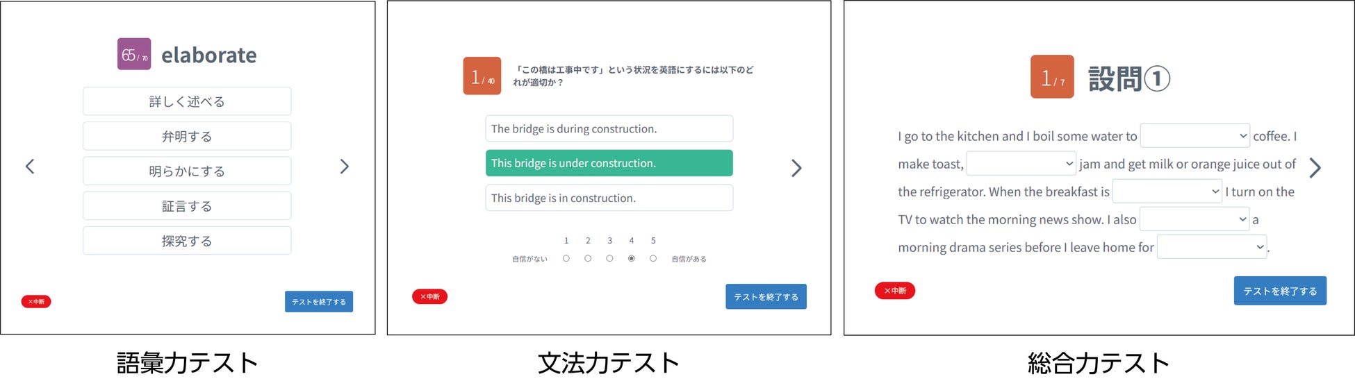 自己評価実施後に「語彙力」「文法力」「総合力」の3つの英語力を客観的に測定する小テストを追加しました。