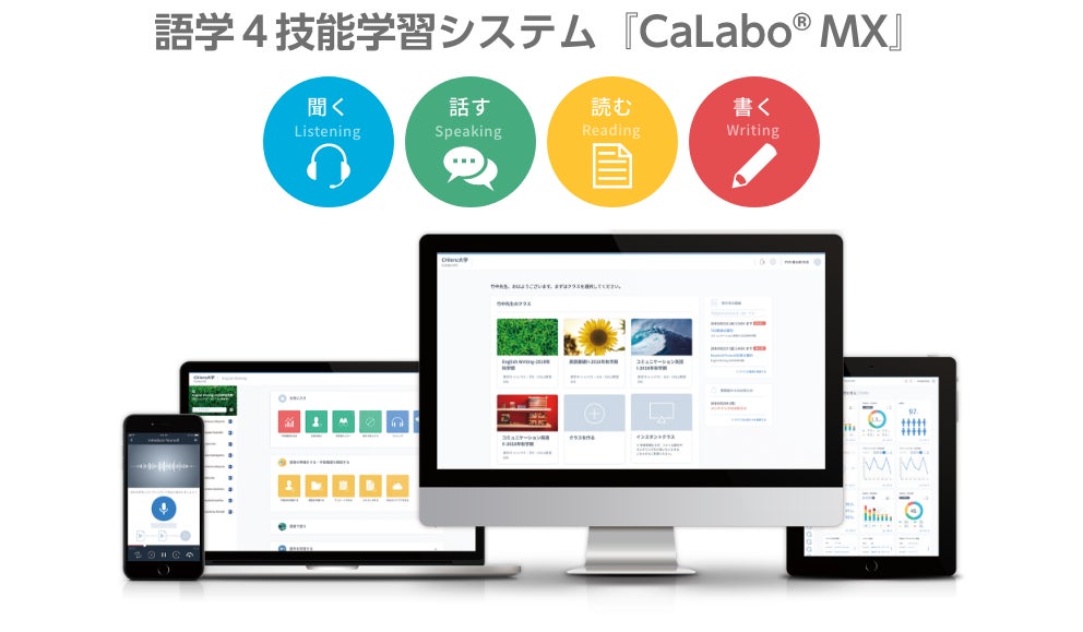 『CaLabo® MX』は、語学の「読む、書く、聞く、話す」の学習に特化したクラウド型*1のシステムで、ノートPCやスマートフォンなど可搬性のあるモバイル端末で利用できるのが特徴です。シャドーイングやディクテーション、語彙テストなどの授業運営に必要な機能に加え、先生に優しい操作性が授業進行をスムーズにします。