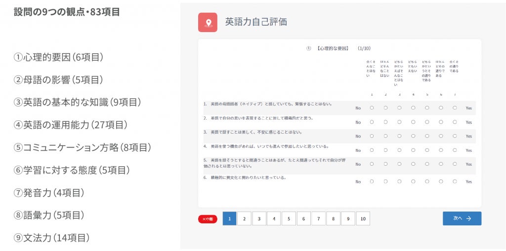 学習者は下記9つの観点・83項目で構成される設問に答えるだけで、自分の英語力を可視化することができます*2。