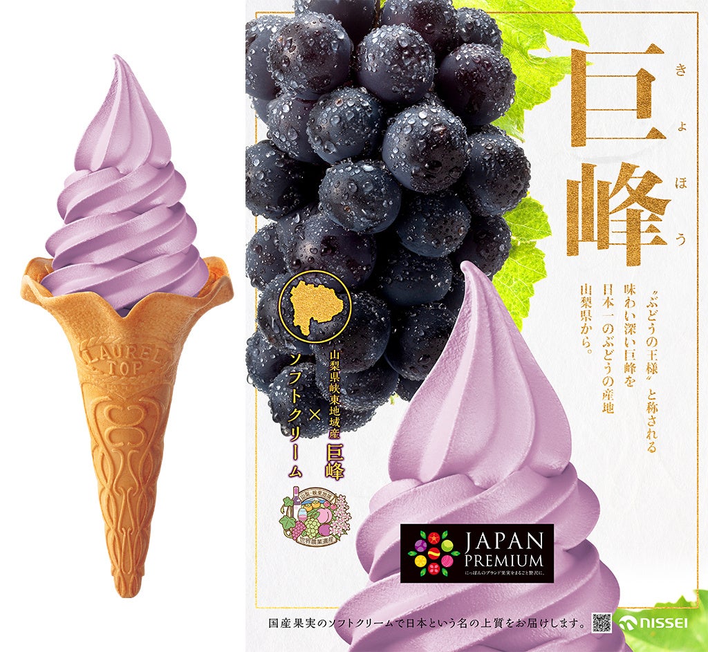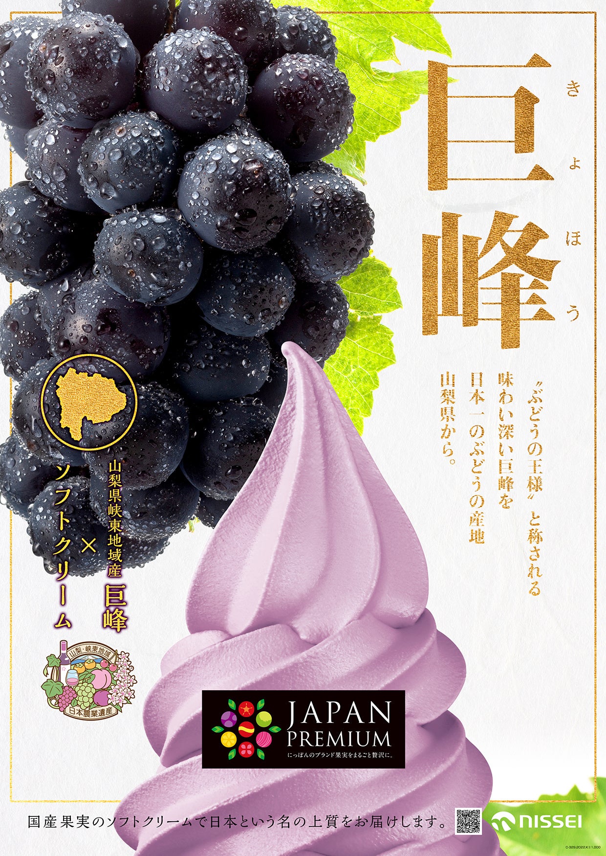 JAPAN PREMIUMシリーズは、原材料の確保の関係からすべて数量限定で販売しており、同一年内の追加生産は致しません。国産ワインの人気が高まったことで、山梨のぶどうは引き合いが多く、ソフトクリームの原料確保に苦労。産地の皆さんのご協力により、なんとか独自のルートで峡東地域産の巨峰を調達することに成功しましたが、2024年の山梨巨峰は、2023年販売実績より若干少ない生産量になります。発売予定期間は、2024年9月18日から2024年11月下旬をめどとしておりますが、在庫終了とともに販売終了となります。