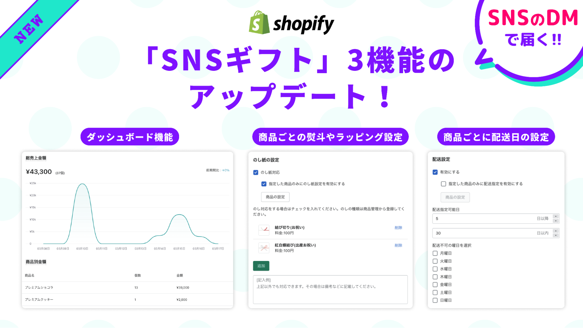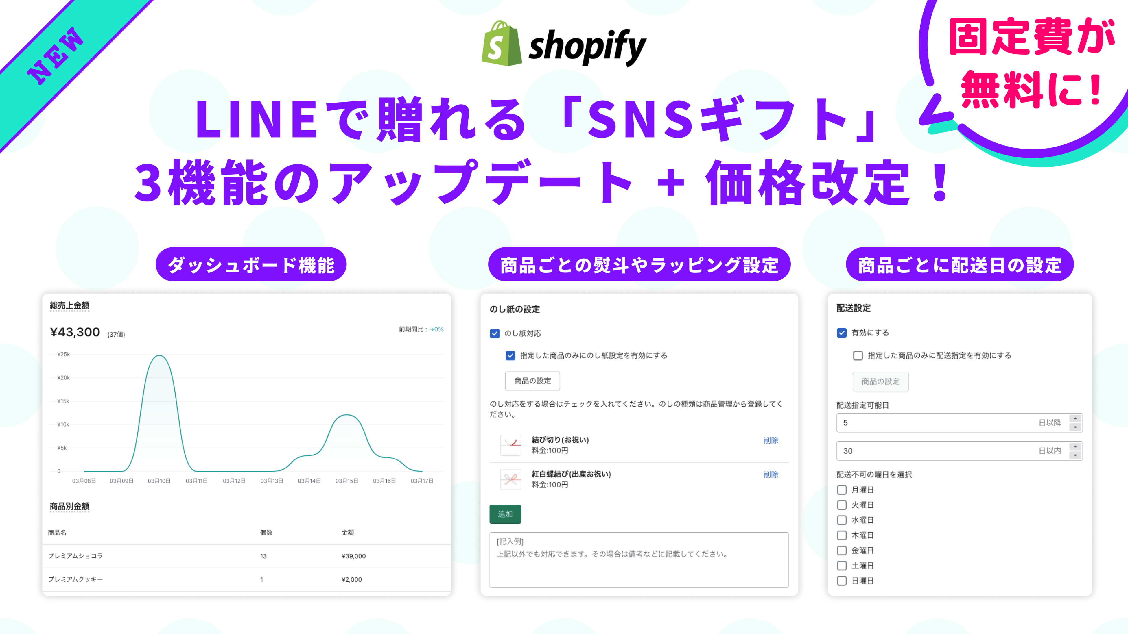 Shopifyアプリ「SNSギフト」、ダッシュボード機能など3機能のリリース!月額費用も無料に!