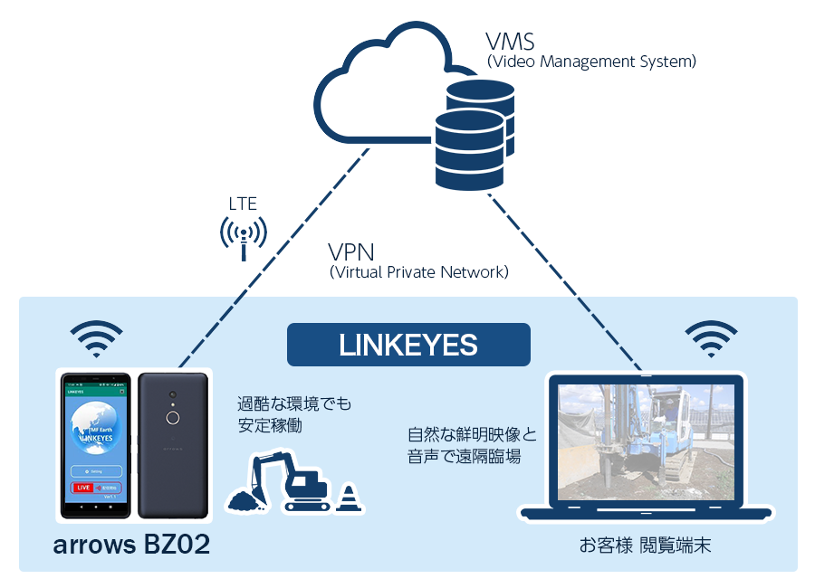 「LINKEYES」は高度な画像圧縮技術により、LTE環境で十分高画質な映像が送信可能です。郊外など、電波環境があまりよくない場所でも、途切れることなく映像の送信が可能な上に、データ通信量を抑えられるので、通信料金負担を軽減します。また堅牢性に優れたFCNTの法人スマートフォン「arrows BZ02」が標準採用されているので、現場で作業員が随時持ち歩いて映像を送信することも、スタンドに設置して定点観測することも可能です。