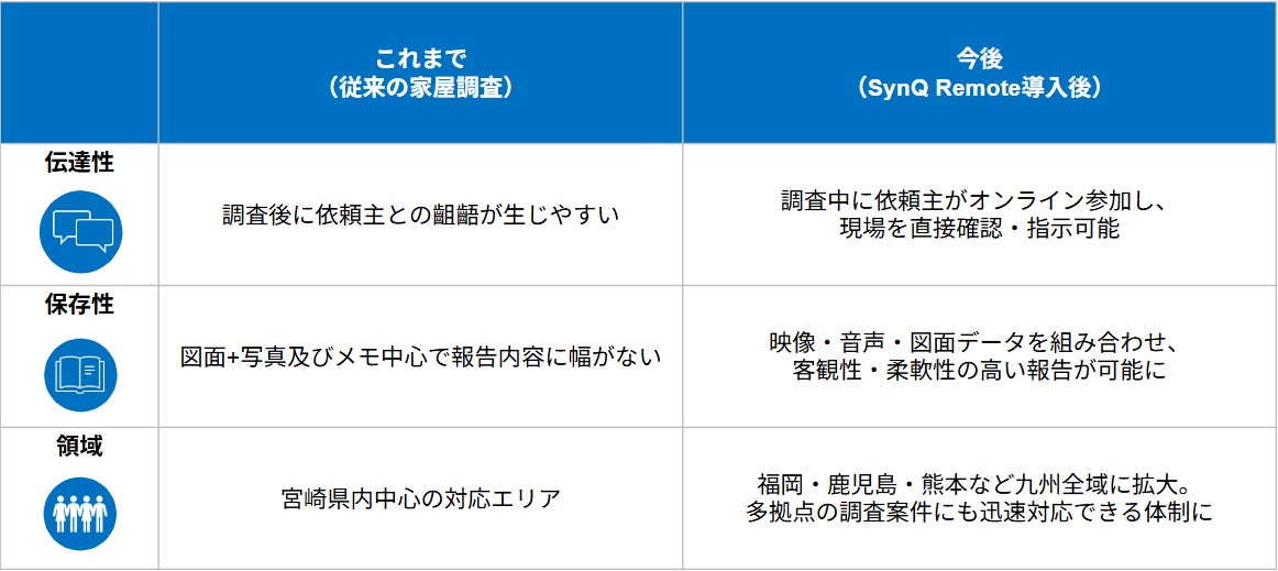 誰とでもつながれる。圧倒的に伝えられる。現場が求めたコミュニケーションツール「SynQ Remote(シンクリモート)」を開発提供する株式会社クアンド(本社:福岡県北九州市、代表取締役CEO:下岡 純一郎)は、M&Aによりグループ化した株式会社南都技研(本社:宮崎県宮崎市、代表取締役:多田佳充)が、九州全域で家屋調査サービスの提供を開始したことをお知らせいたします。家屋調査業務のDX化により、これまで対応の難しかった広域の案件にも柔軟に対応できる体制が整備され、公共事業のみならず、ゼネコンや民間ディベロッパーなど多様な発注者からのご依頼にも応じやすくなり、調査対象の幅が着実に広がる効果が期待されます。