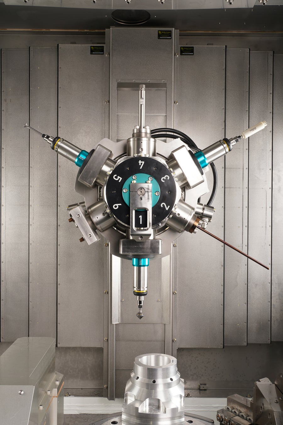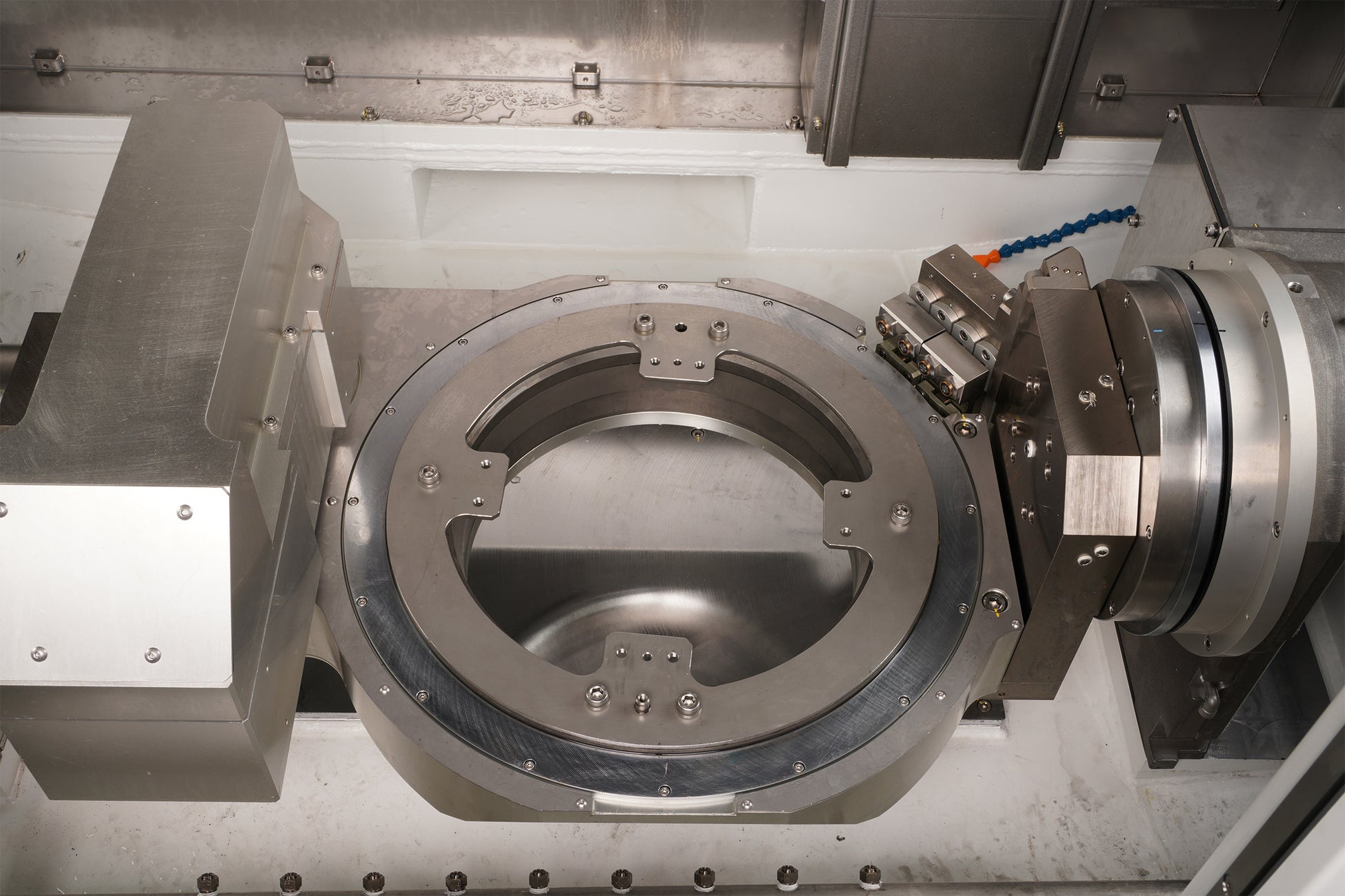 全ての面を一台でバリ取り・洗浄するために新開発した、底面がオープンになっている中空2軸傾斜円テーブルを搭載。割り出し5軸制御により、取り付け面も含めたワークの6面全てでバリ取りが可能です。斜めに空いた穴やリブ部などへも容易にアクセスできます。