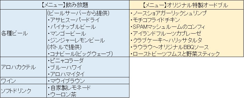 当日は、ビールサーバーからハワイアンビール等を提供するほか、ハワイを感じる爽やかでフルーティな香りのコナビール(ビッグウェーブ)、アロハカクテルを含む11種類が飲み放題です。