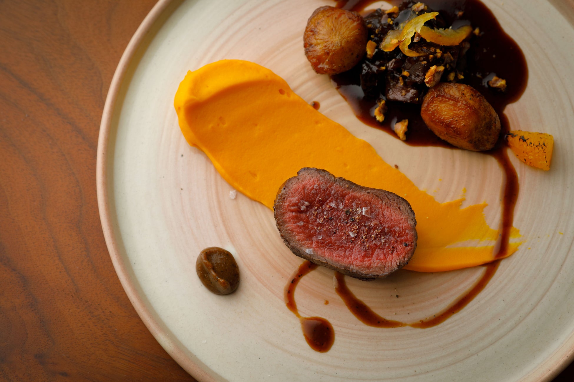 京都の豊かな自然が育んだ丹波産の鹿肉を、贅沢に用いた特別なひと品。 鹿のロインは香ばしくローストし、しっとりとした食感と野性味あふれる旨味を引き出しました。 腕肉とすね肉はじっくりと煮込み、ソースへと仕立てることで、異なる部位の個性を一皿に凝縮しています。添えるのは、夏に収穫し熟成させたバターナッツかぼちゃのピューレ。自然な甘みと濃厚な風味が鹿肉の力強さを引き立てます。仕上げに、コーヒーと味噌を合わせたオリジナルの「コーヒー味噌」を。ほろ苦さと発酵の旨味が重なり合い、奥行きのある味わいを演出いたします。丹波の恵みと料理人の技が織りなす、冬ならではの美食体験が叶う一皿です。