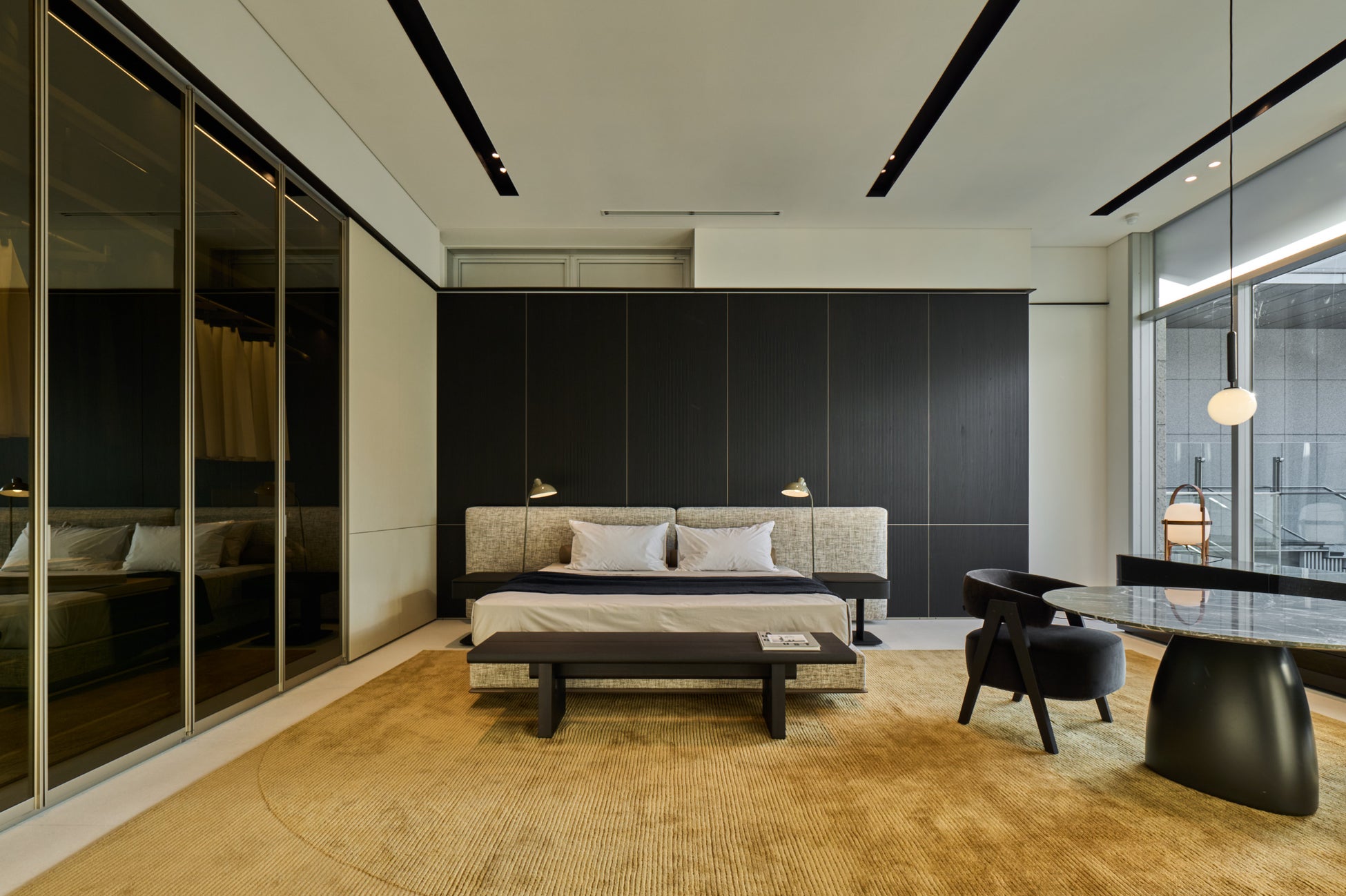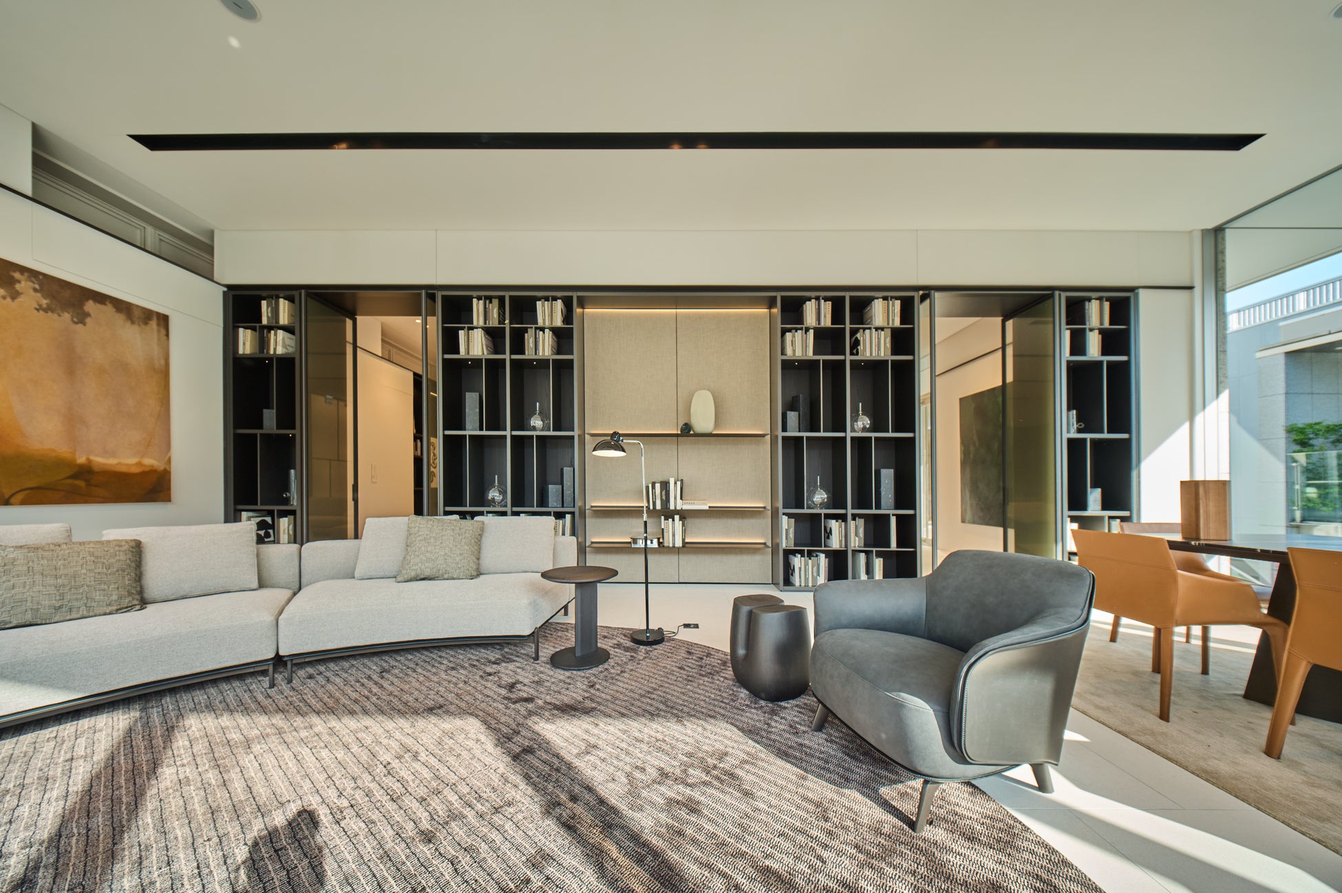 収納家具がブランドのルーツであることもあり、<Poliform>のシグニチャーであるシステム収納を数多く提案しています。衣類やパーソナルアイテムを機能的かつ美しく洗練された方法で収納できるよう設計された空間を体験出来ます。