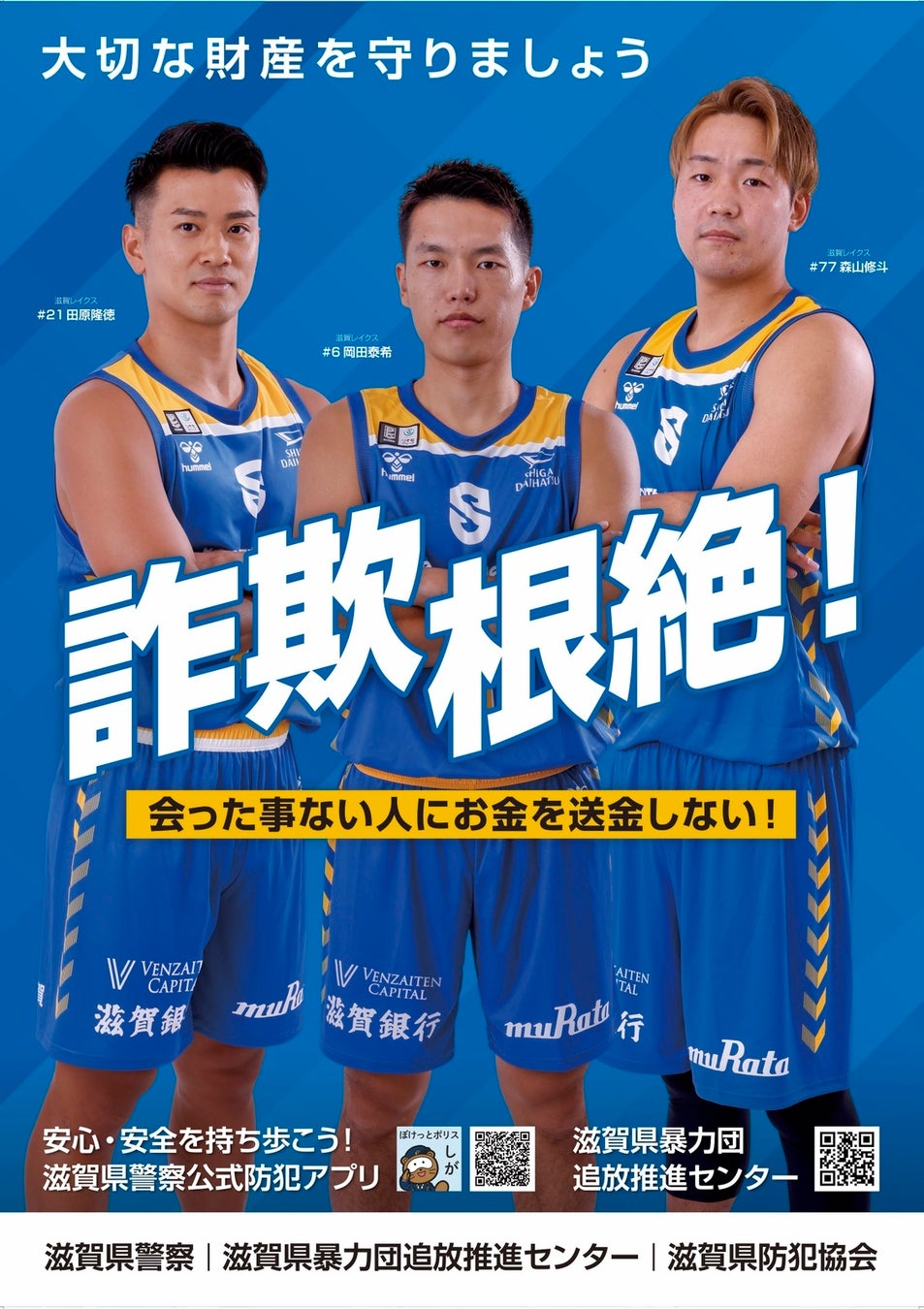ポスターは「不当要求防止啓発(野本大智選手)」「詐欺被害防止啓発(田原隆徳選手、岡田泰希選手、森山修斗選手)」「薬物乱用防止啓発(常田耕平選手)」の3種類で、今後は滋賀県警察や県内の公共施設、金融機関などに掲出される予定です。