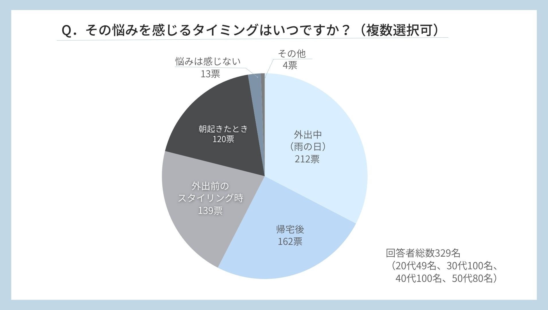 次いで「悩みを感じるタイミングは?」と尋ねたところ、最も多かった回答は「外出中」や「帰宅後」が多数派。日中に髪の乱れを感じている人も多い傾向にありました。