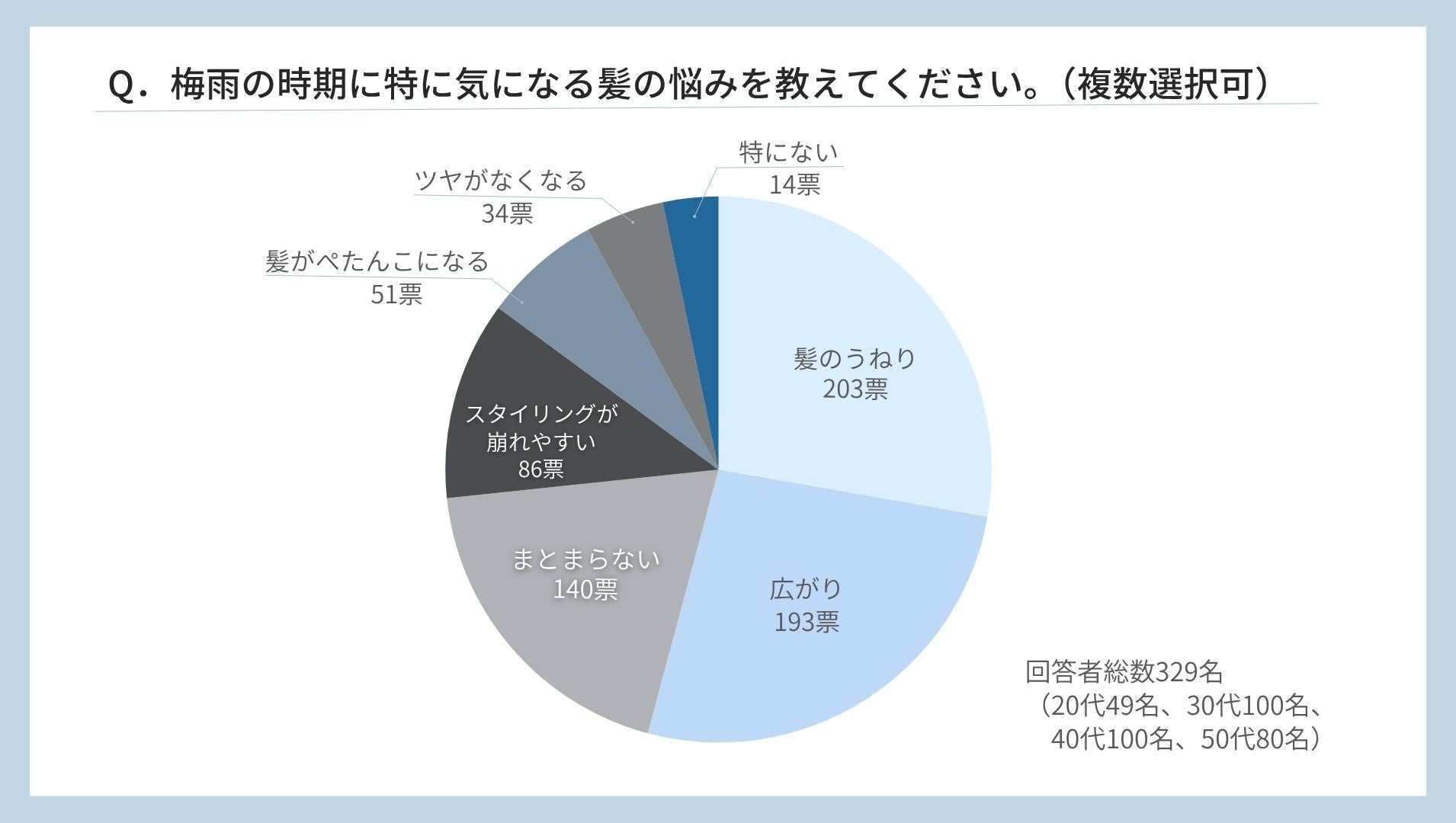 アンケート調査で「梅雨の時期に特に気になる髪の悩みを教えてください。」と尋ねたところ、最も多かった回答は「髪のうねり」で203票(約63%)でした。