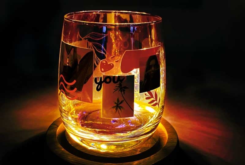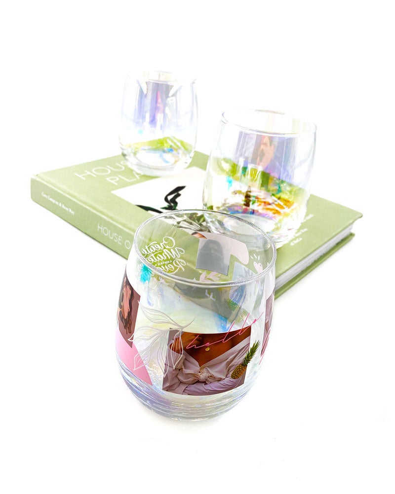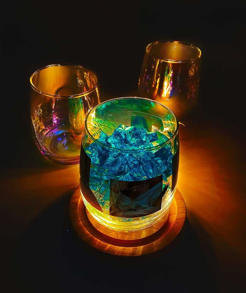 お気に入りの写真・イラスト・名入れなどをロックグラスにぐるっと全面プリント可能です。他では作れないオリジナルリティあふれるオーロラグラスを1個から作成頂けます。