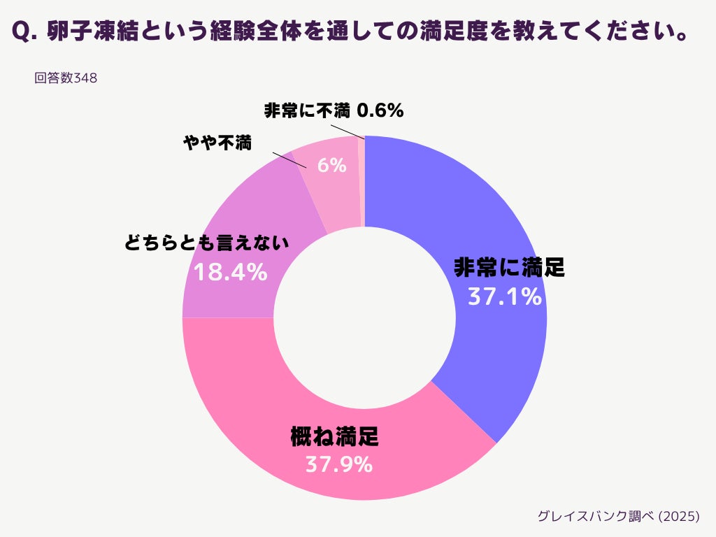 卵子凍結保管サービス「Grace Bank(グレイスバンク)」を運営する株式会社グレイスグループ(本社:東京都渋谷区、代表取締役CEO:勝見 祐幸、以下「グレイスグループ」)は、卵子凍結の経験がある女性348名を対象に「卵子凍結に関する実態調査」を実施しました。その結果、経験者のうち、4人に3人である75%が卵子凍結をして「満足」と回答し、一方で「満足とは感じなかった」と回答された方が6%にとどまり、大多数の方が卵子凍結をしてよかったと感じていることがわかりました。