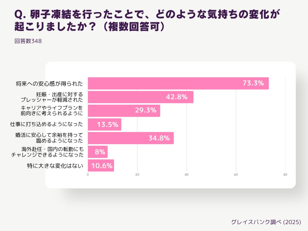 卵子凍結をしたことで得られた気持ちの変化を聞いたところ、最も多く挙げられたのが「将来への安心感」です。漠然とした将来への不安や、「早く結婚・出産しなくては」という内外からのプレッシャーから解放され、自分らしい人生の舵を取り戻した女性たちの声が数多く寄せられました。