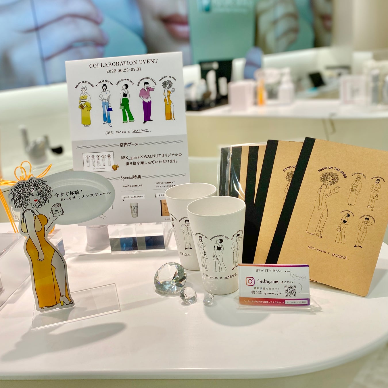 このスペシャルイベントは6月22日(水)~7月31日(日)までBEAUTY BASE by Kao銀座店にて開催している「BBK_ginza × WALNUT コラボレーションイベント」の一環です。同期間中、ウィンドウや店内に、WALNUTさんのイラストが登場。WALNUTさんの素敵な世界観の中で、新発売の「エスト バイオミメシス ヴェール」やエスト商品をお試しいただけます。また、コラボレーショングッズが当たるキャンペーンやご購入金額に応じたプレゼントも用意しています。